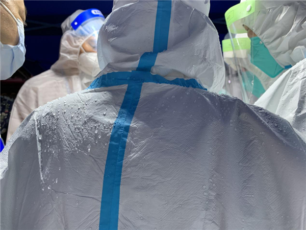 队员在老楼梯楼上门为社区居民进行核酸采样。轮班下来的医护人员,防护服里满是汗水,脸上被勒出深深的红印,有人渴得一口气猛灌3瓶水,还有人疲惫至极席地而睡,但却没有一个人叫苦叫累。