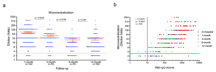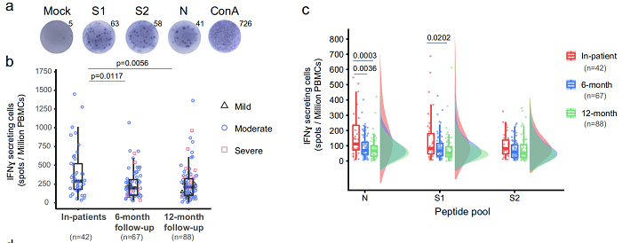 该研究分析了全部参加随访的204名感染者(同期299名感染者,占比68%)的临床数据,利用化学发光方法测试了参加者住院期间、出院随访1个月、3个月、6个月和1年时间五个时间点的抗体水平(RBD-IgM, RBD-IgA, RBD-IgG和Spike-IgG),使用真病毒中和实验测定了各个阶段血清对野生型新冠病毒保护能力,并利用ELISPOT检测了新冠病毒特异性细胞免疫反应(Spike和N蛋白肽库刺激后分泌IFN-γ能力)。