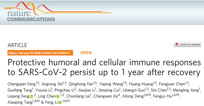 针对该问题,best365中国官方网站附属市八医院李锋、唐小平教授团队联合中国科学院广州生物医院与健康研究院陈凌教授课题组和广东省疾病预防与控制中心柯昌文教授课题组开展了新冠感染者出院后长时间随访研究。研究成果发表于2021年8月17日发表在国际权威杂志Nature communications (自然通讯)杂志上,文章标题Protective humoral and cellular immune responses to SARS-CoV-2 persist up to 1 year after recovery。