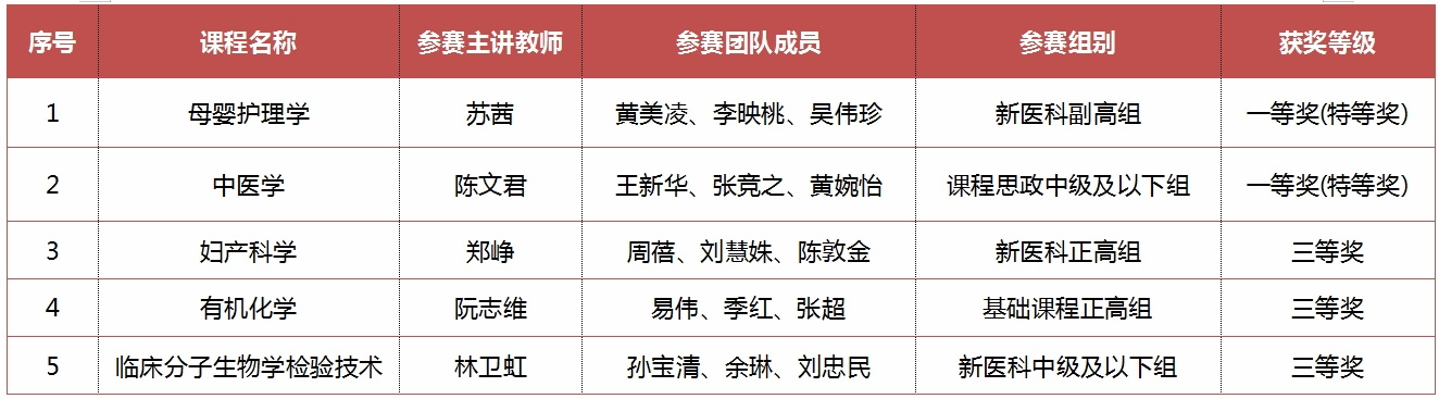 日前,第四届全国高校教师教学创新大赛广东分赛暨广东省高校教师教学创新大赛获奖名单公示结束,best365在本届比赛中再次实现新突破,教师团队荣获一等奖(特等奖)2项、三等奖3项,学校获优秀组织奖。其中,护理学院苏茜副教授《母婴护理学》课程团队荣获新医科赛道副高组一等奖(特等奖),第二临床学院陈文君老师《中医学》课程团队荣获中级及以下组一等奖(特等奖)。