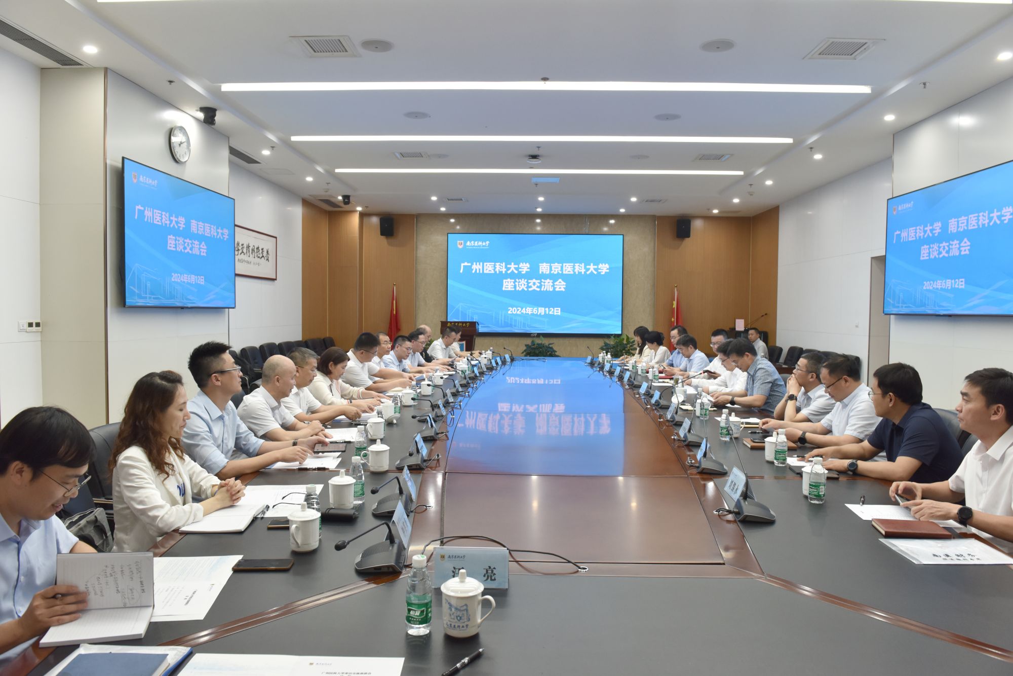 在南京医科大学,双方举行座谈交流会。双方介绍了各自的基本情况,南京医科大学教务部、科研院以及学科建设与发展规划处还分别就学校教学改革、科研工作、学科建设进行了详细的介绍。双方围绕教育教学、学科建设、人事改革、医院管理、校院两级管理、学生管理等方面工作开展了深入沟通交流。南京医科大学校长胡志斌,副校长冯锋以及相关职能部门负责人参与座谈交流。