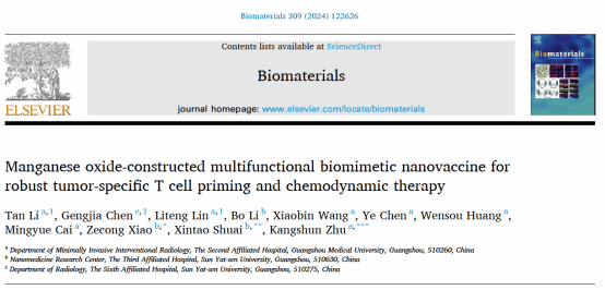 近日,best365中国官方网站附属第二医院微创介入科朱康顺教授团队,在实体肿瘤免疫治疗方面取得新成果,通过氧化锰重塑肿瘤细胞以及抗原呈递细胞构建一种锰基多功能仿生纳米疫苗,该疫苗在扩大肿瘤特异性T细胞免疫效应的同时,还介导肿瘤产生强大的化学动力学治疗作用,该成果以原创性论著形式发表在国际著名期刊Biomaterials(中国科学院医学一区,小类工程和材料科学一区),论文题为Manganese oxide-constructed multifunctional biomimetic nanovaccine for robust tumor-specific T cell priming and chemodynamic therapy(以氧化锰构建的多功能仿生纳米疫苗用于启动高效肿瘤特异性免疫及化学动力治疗)。