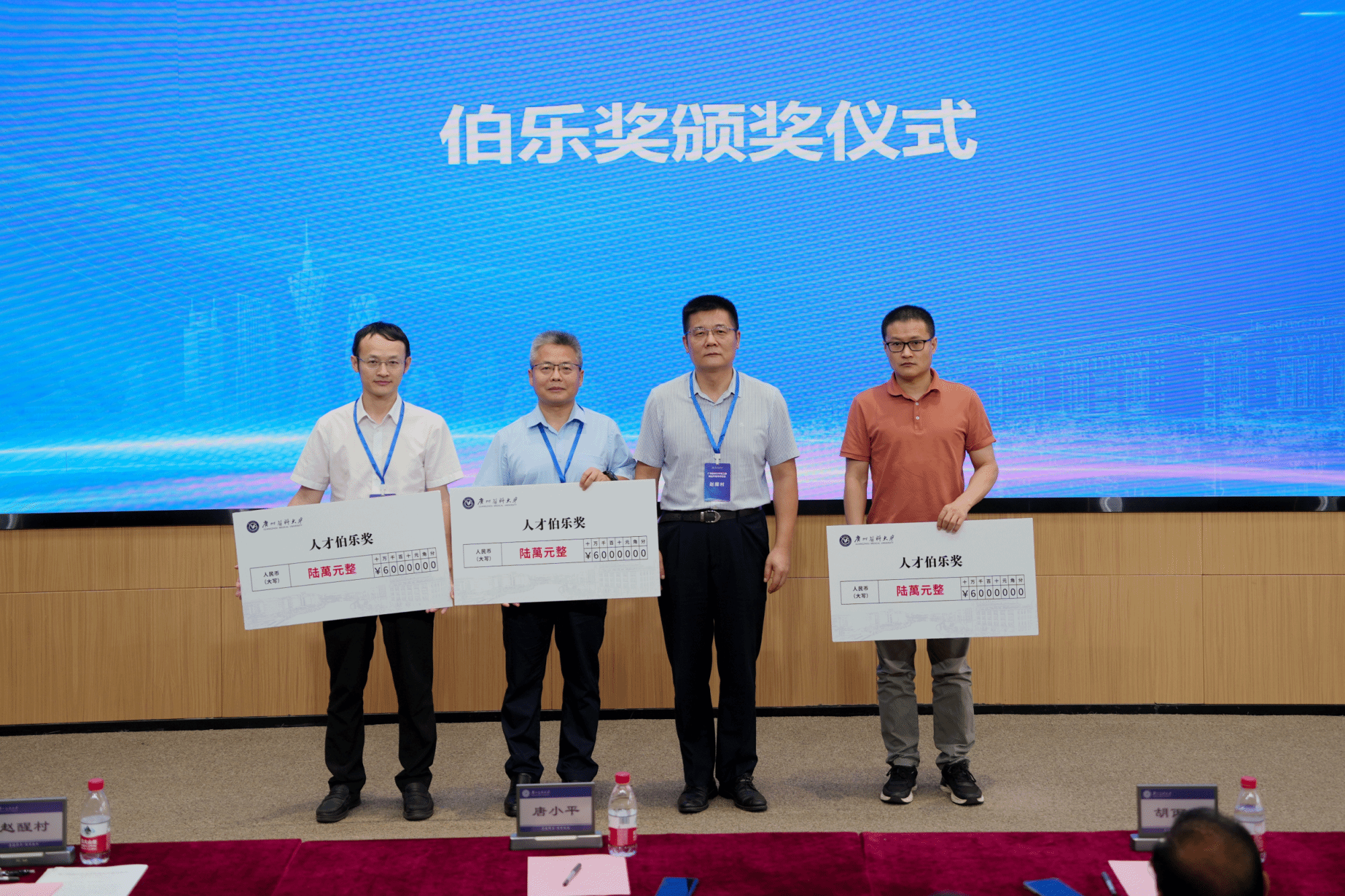 学校为加快推进人才队伍建设,调动全校教职工引才荐才积极性,于2023年修订出台了人才举荐奖励管理办法,对在高层次人才引进工作中作出突出贡献的教职工予以绩效奖励。2024上半年度“伯乐奖”的获奖人分别是附属口腔医院党委书记张清彬教授、呼吸疾病全国重点实验室殷文广教授、附属第五医院廖宝剑副研究员,赵醒村校长为获奖者颁奖。