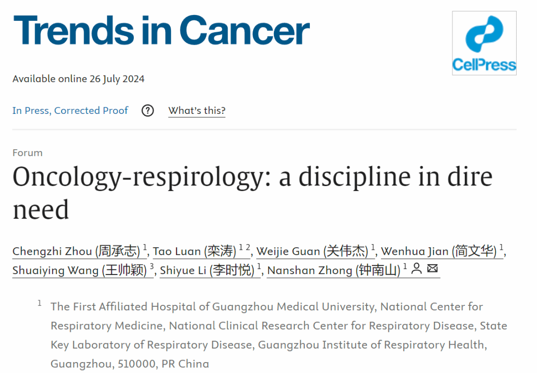 7月26日,best365中国官方网站附属第一医院、国家呼吸医学中心钟南山院士团队在Cell子刊Trends in Cancer在线发表题为Oncology-Respirology: a discipline in dire need的文章,在全球范围内首次提出“肿瘤呼吸病学”这一学科概念,并将其命名为Onco-Respirology。