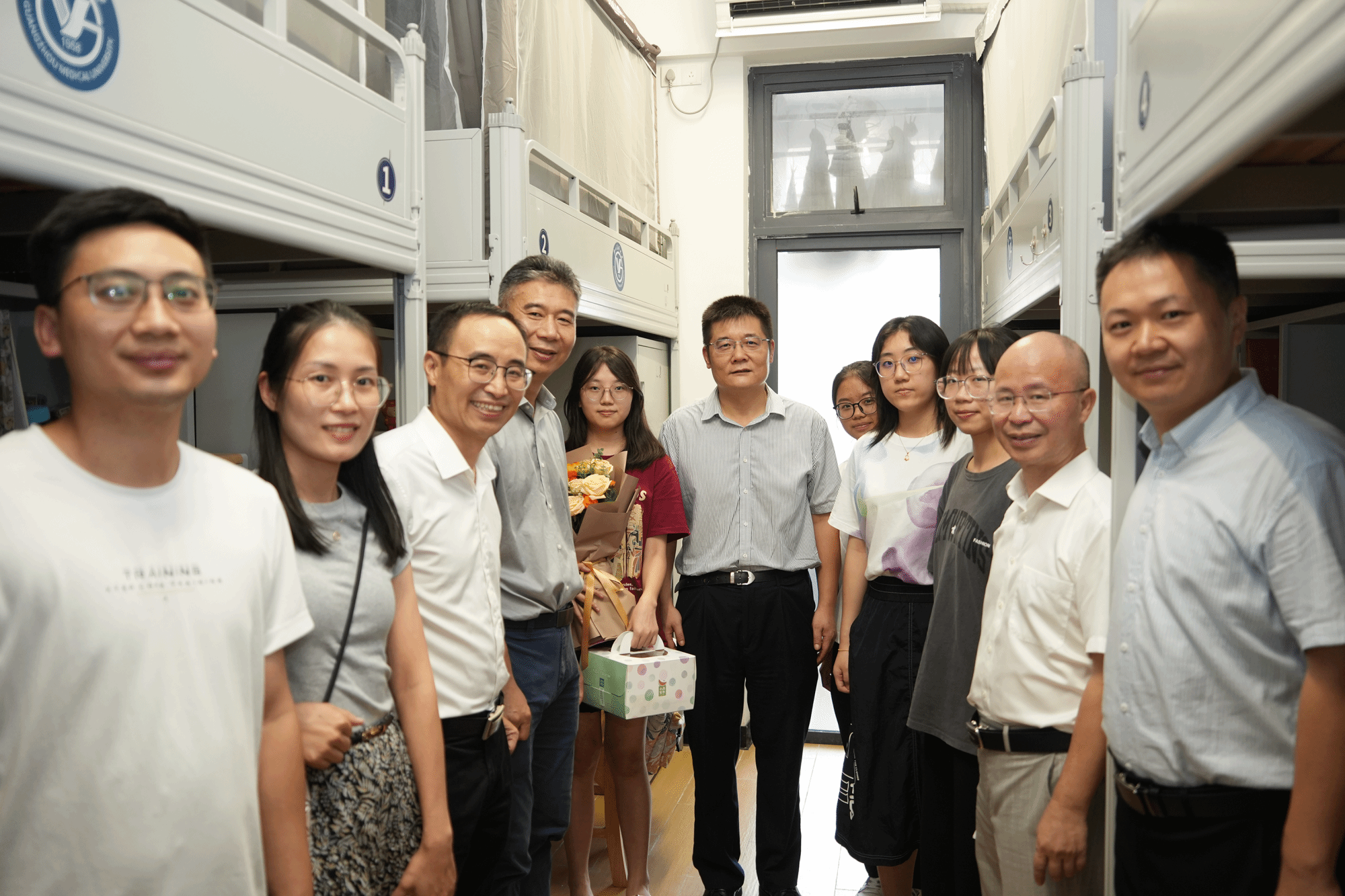 校长赵醒村、副校长周麟以及相关部门负责人、辅导员老师到番禺校区宿舍看望慰问新生,并为今天生日的本科新生送上蛋糕、鲜花与祝福。