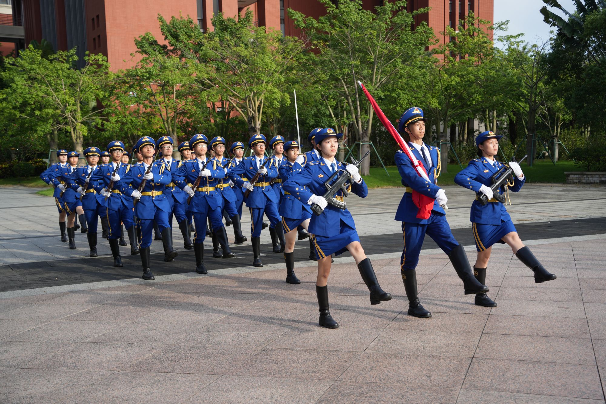 国旗护卫队员昂首挺胸,迈着矫健的步伐,庄严地走向升旗台。