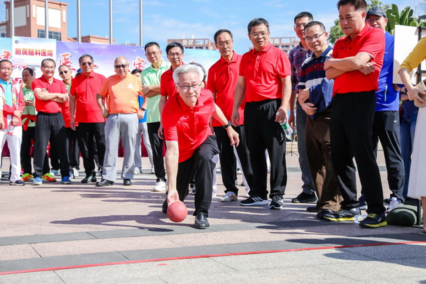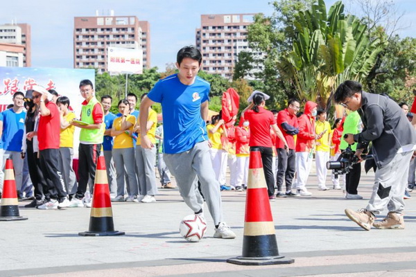 本次教职工集体趣味运动会共设置了5项比赛项目,分别为趣味保龄球赛、足球运球绕障碍接力赛、羽毛球接发球赛、“龙腾飞跃”比赛以及20*30米来回接力赛。平日安静的正门广场,当日热闹非凡,随处可见教职工运动健儿们矫健的身姿, 11支队伍积极拼搏,展现了广医人团结奋进的精神风貌。