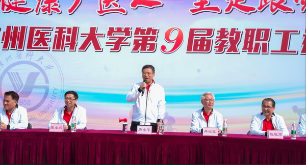 学校领导班子全体成员、广医系统11个单位共525名教职工参加了运动会开幕式表演和比赛。学校党委书记唐小平宣布运动会开幕。