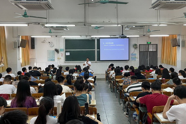 作为资深的传染病学教授,唐小平书记在非典型性肺炎、新冠肺炎等传染病疫情防控中为维护人民生命健康作出了积极努力和重要贡献。他先从自身经历说起,谈起“传染病学”曾经不被人了解,随着2003年“SARS”爆发,医护人员全力救治患者,人们才慢慢认识这个学科。而蔓延全球的新冠肺炎疫情,再次让人们意识到传染病学的重要性。他讲述了传染病概述,传染病的诊断、治疗和预防等知识,并在讲述中融入课程思政元素。他提醒同学们不论以后从事哪个专业,均需要掌握基本的传染病学知识,牢记询问流行病学史,避免漏诊。课程的尾声,唐小平教授表示,传染病防控永远在路上,同学们需要时刻警醒,掌握好传染病防控知识和技能,更好地维护和促进人民生命健康。