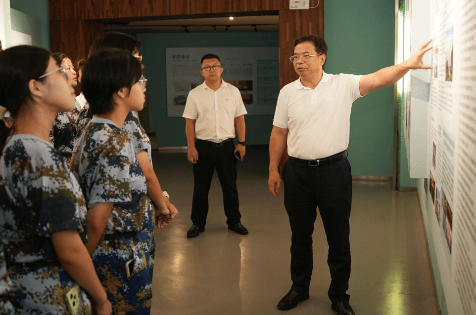 学校领导、学生工作处负责人和学生讲解员为2024级本科生讲解校史