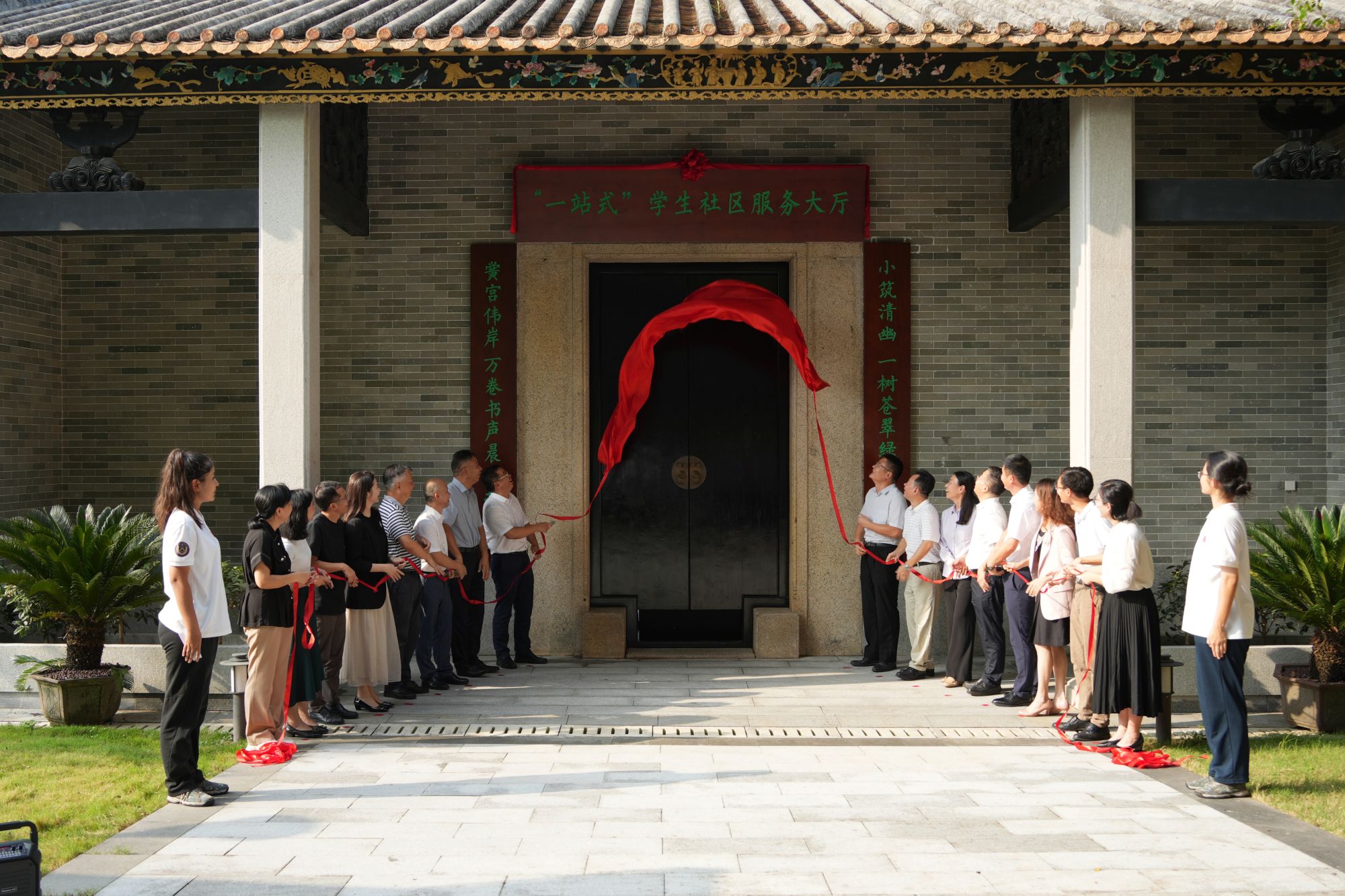 学校领导与相关部门负责人共同为“一站式”学生社区服务大厅揭牌