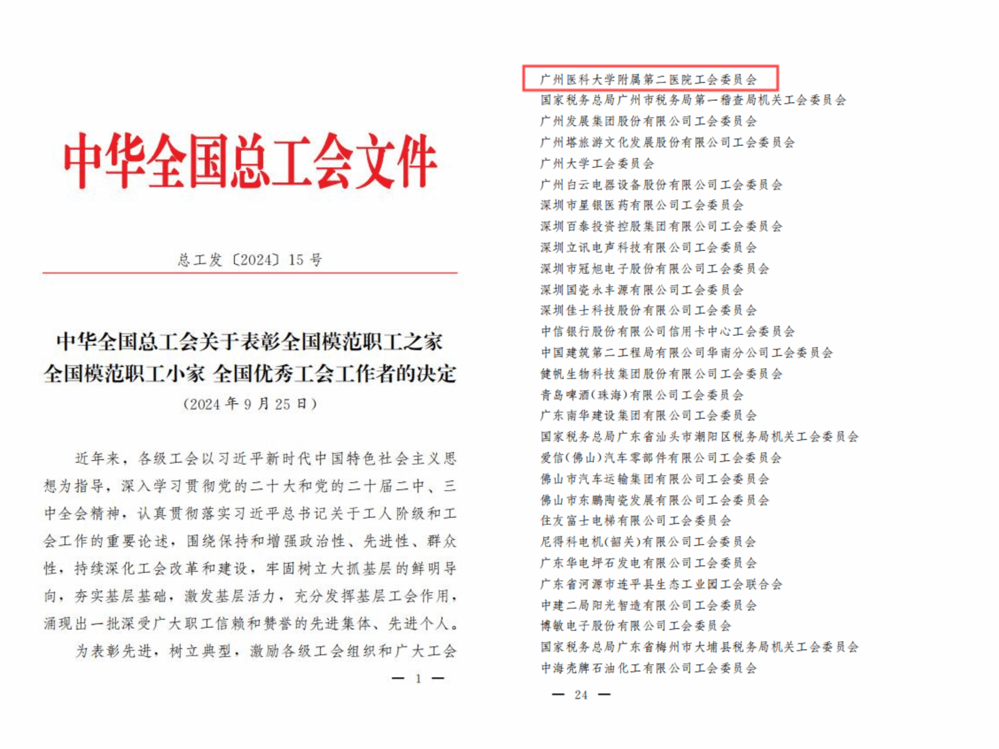 近日,中华全国总工会发文对一批先进集体、先进个人进行表彰,996个集体获“全国模范职工之家”称号,1000个集体获“全国模范职工小家”称号,798名个人获“全国优秀工会工作者”称号。其中,广东省内共有69个单位荣获“全国模范职工之家”称号,best365中国官方网站附属第二医院工会入选其中。