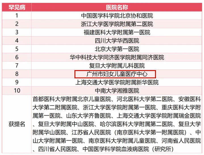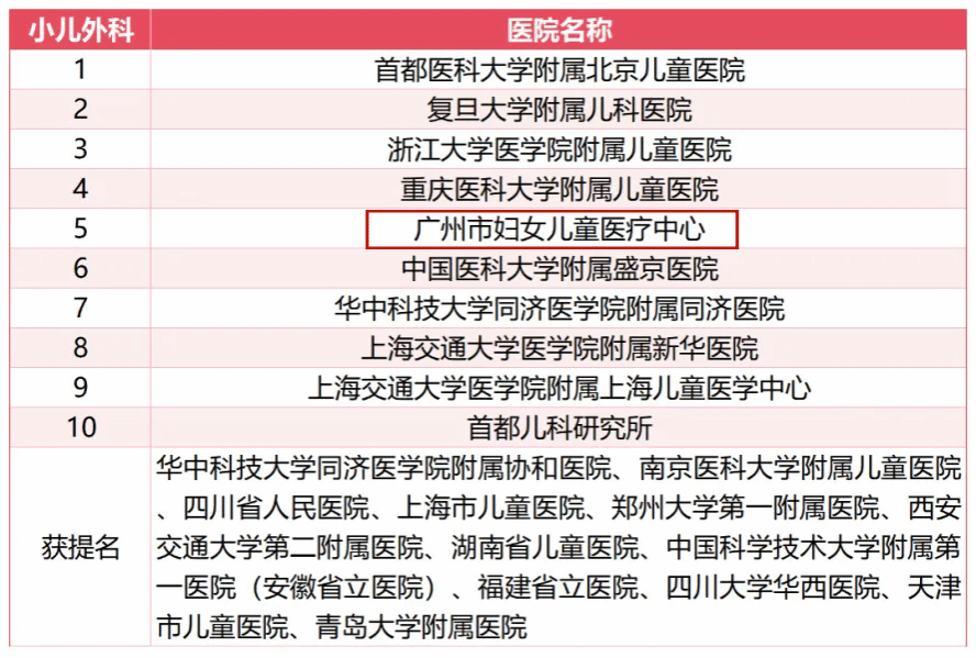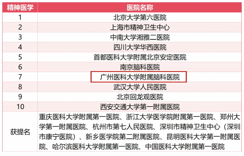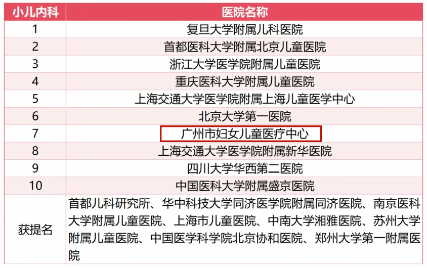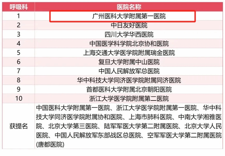 除了位居榜首的呼吸科以外,附属第一医院变态反应科排名全国第5,胸外科排名全国第5;附属第二医院变态反应科排名全国第7;附属脑科医院精神医学排名全国第7;附属妇女儿童医疗中心(广州市妇女儿童医疗中心)小儿外科排名全国第5、小儿内科排名全国第7、罕见病排名全国第8。此外,获得专科声誉排行榜提名的有附属第一医院重症医学、泌尿外科和附属第二医院疼痛学。