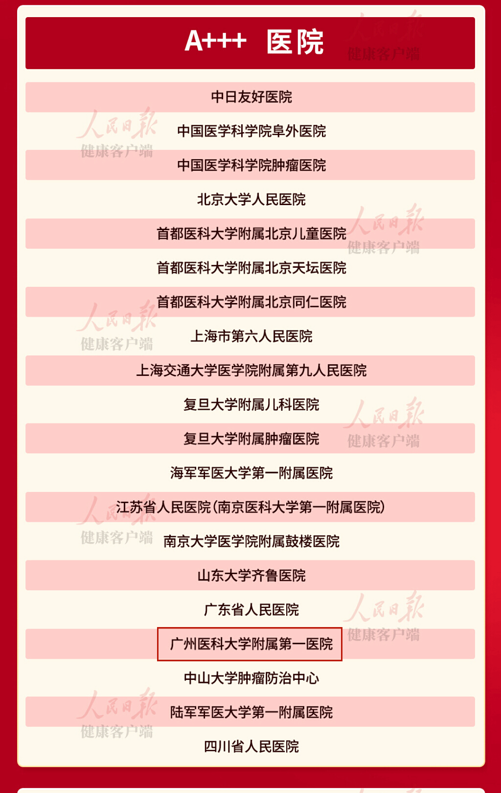 据悉,今年复旦版《2023年度中国医院综合排行榜》在各大医院名次的“表达”方法有了重大改变,百家医院由原来的第1至第100名顺序排名变为不直接排名,而是分为A++++、A+++、A++、A+和A五个等级,每一等级20家医院,A++++为最高等级。医院排名先后按行政大区编码(华北、东北、华东、华中、华南、西南、西北)排列;同等级排名不分先后,院名首字母笔画少在先。