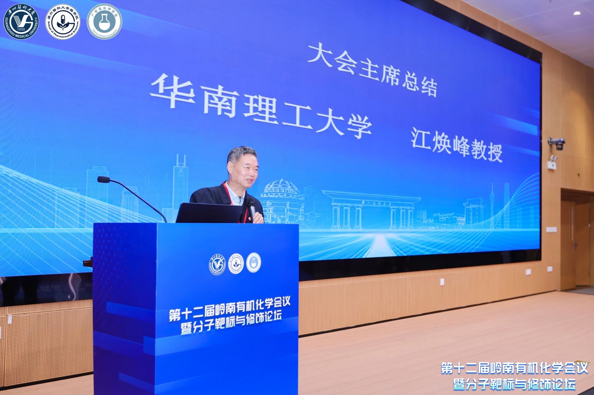 岭南有机化学论坛创办人、广东省化学学会副理事长江焕峰教授作大会总结讲话。他表示,岭南有机化学迄今已举办了十二届,已成长为国内一个拥有重要影响力的品牌。本届岭南有机化学会议与分子靶标与修饰论坛联合举办,起到了良好的学科交叉融合示范效应。与会专家、学者在各领域深度研讨,进一步开阔了与会者的视野,提升了学术水平,同时增强了论坛的品牌影响力,使之成为繁荣有机化学学术、推动创新医药研制的重要平台,推动有机化学和医药行业高质量发展。