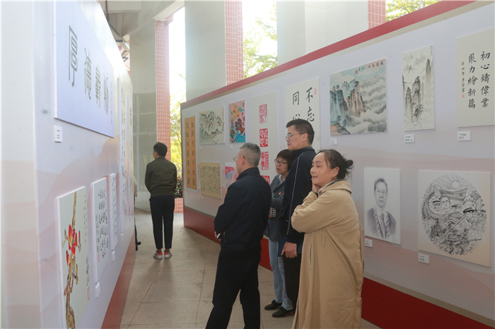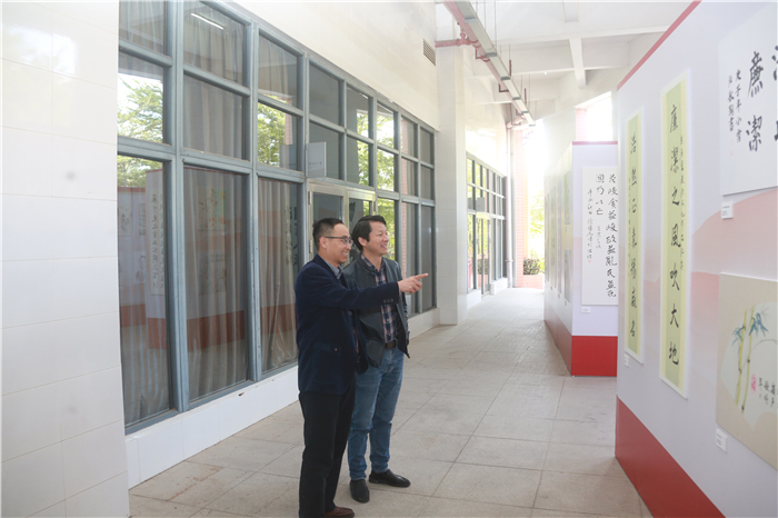 开幕式后,学校领导、书画作者代表、教职工代表在现场参观展览。