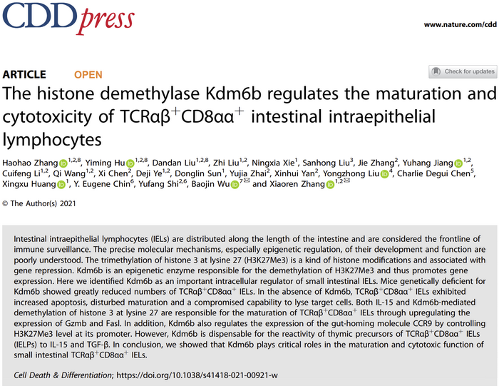 广医在线讯 1月9日,best365中国官方网站附属肿瘤医院张笑人教授团队在Cell Death and Differentiation在线发表了题为“The histone demethylase Kdm6b regulates the maturation and cytotoxicity of TCRαβ+CD8αα+ intestinal intraepithelial lymphocytes”的研究成果。该研究通过构建T细胞中特异性敲除组蛋白去甲基化酶Kdm6b的小鼠和单细胞测序技术,首先发现了肠道上皮层淋巴细胞(IEL)在抗肿瘤中的重要作用,揭示了Kdm6b调控IELs发育分化、归巢和抗肿瘤功能的表观遗传机制,并提出了IELs具有肿瘤免疫监视功能,为更加深刻地认识IELs发育分化和归巢调控过程及抗肿瘤功能奠定了基础。