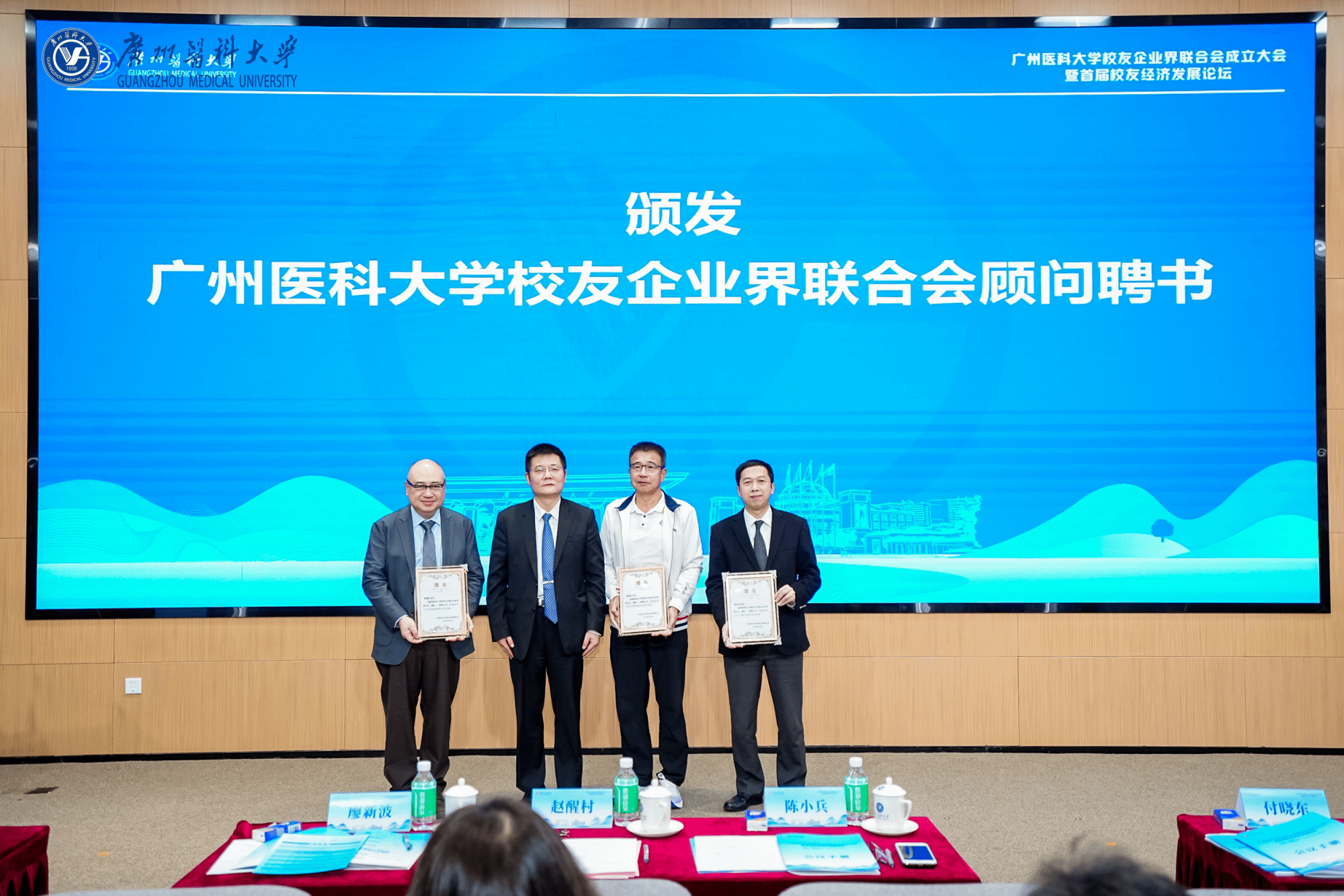 赵醒村校长为廖新波校友、陈小兵校友、黎毅敏校友颁发联合会顾问聘书