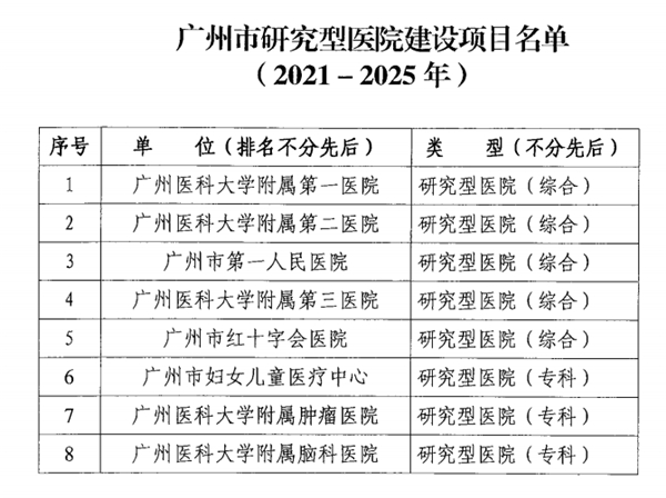 广医在线讯 为加快广州市医疗高地建设步伐,根据《广州市加快医疗高地建设工作方案(2020-2025年)》,广州市卫生健康委组织了广州市研究型医院评审工作,经过多轮材料和现场评审,广州市共有8家医院入选建设名单。best365附属第一医院、附属第二医院、附属第三医院入选广州市研究型综合医院建设名单;附属肿瘤医院及附属脑科医院入选广州市研究型专科医院建设名单。