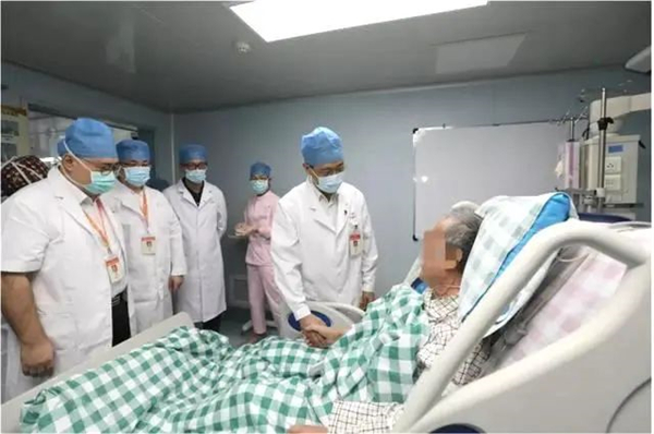 经过广医一院医护团队的精心救治,全球使用体外膜肺氧合(ECMO)时间最长的新冠肺炎患者康复出院。图为钟南山院士等专家在ICU探望该患者。