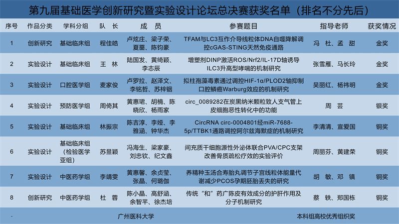 第九届全国大学生基础医学创新研究暨实验设计论坛总决赛获奖名单