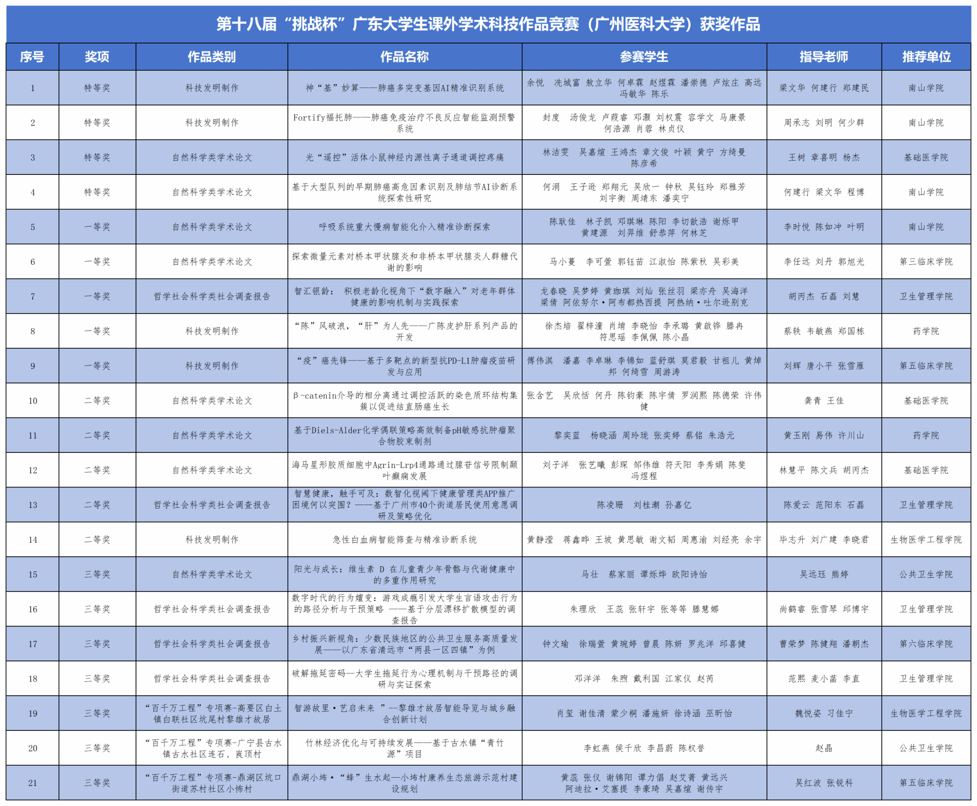 其中,广医荣获特等奖的作品为《神“基”妙算——肺癌多突变基因AI精准识别系统》《Fortify福托肺——肺癌免疫治疗不良反应智能监测预警系统》《光“遥控”活体小鼠神经内源性离子通道调控疼痛》《基于大型队列的早期肺癌高危因素识别及肺结节AI诊断系统探索性研究》。