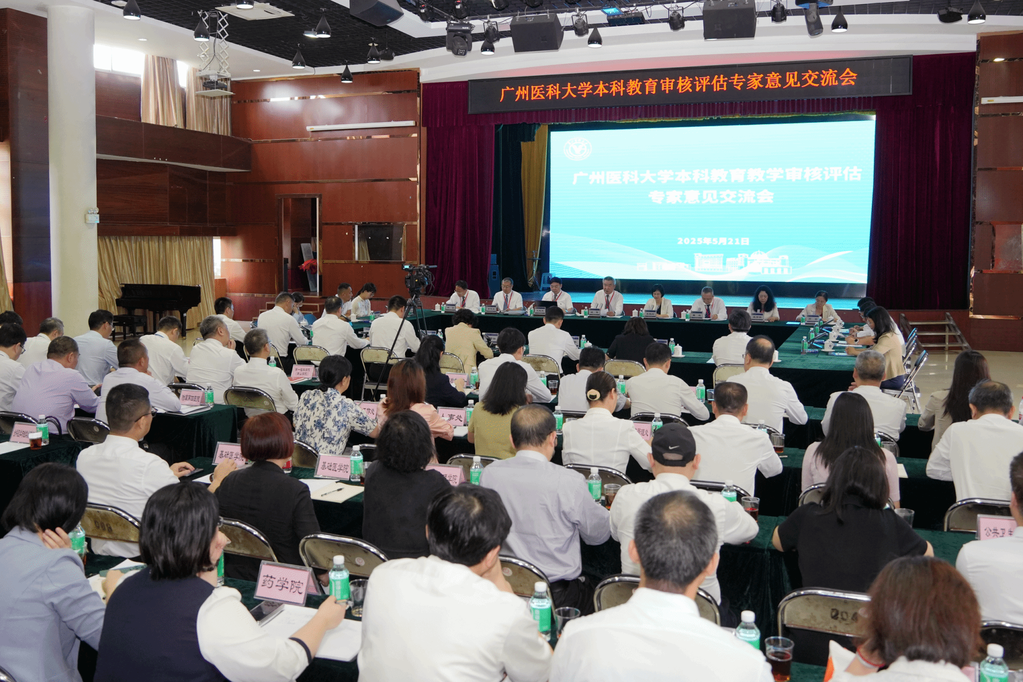广东省教育厅高等教育处副处长吴华明、广州市教育局市管一级调研员林平等专家、领导,专家组项目管理员广州中医药大学中药学院党委副书记王建刚、秘书广东医科大学教务部七级职员尹晓钧、见习项目管理员及秘书华南农业大学珠江学院教务处副处长张峻、广州商学院质量管理与评建办公室主任助理陈珊,学校领导,各党群部门、行政部门、教辅部门、学院和附属医院主要负责人,分管教学和学生工作的相关人员参加会议。
