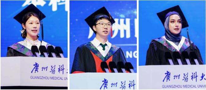 吴小瑾、蔡尚桦、Ambreen分别代表毕业本科生、研究生、留学生发言。他们分享了在广医学习生活的体验与收获,并代表毕业生向师长的培养之恩表达最衷心的敬意与感谢。