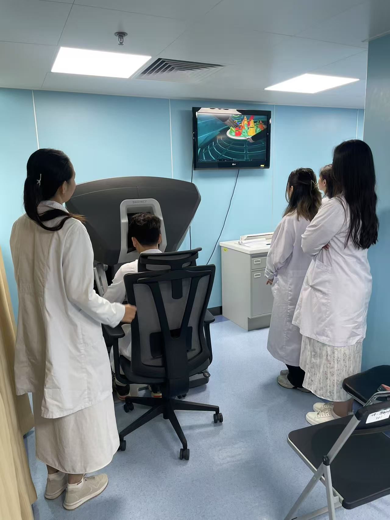 临床见习分为两个阶段进行。在妇产科,代表团系统学习诊疗流程,观摩特色技术操作;在泌尿外科,代表团现场观摩达芬奇机器人手术。手术中,机器人手臂的精准与高效使代表团成员留下深刻印象,学生代表ALI KHIUAZ激动地表示:“机器人手术系统的精准度颠覆了我的认知,这次宝贵的实操经验极大地拓展了我对智能医疗的理解。我渴望将这些前沿技术知识带回哈萨克斯坦,应用于我们的临床实践。”不仅如此,学员们还参与了实操训练,在专业老师的指导下,动手体验了机器人手术的操作流程,进一步加深了对智能医疗技术的理解。
