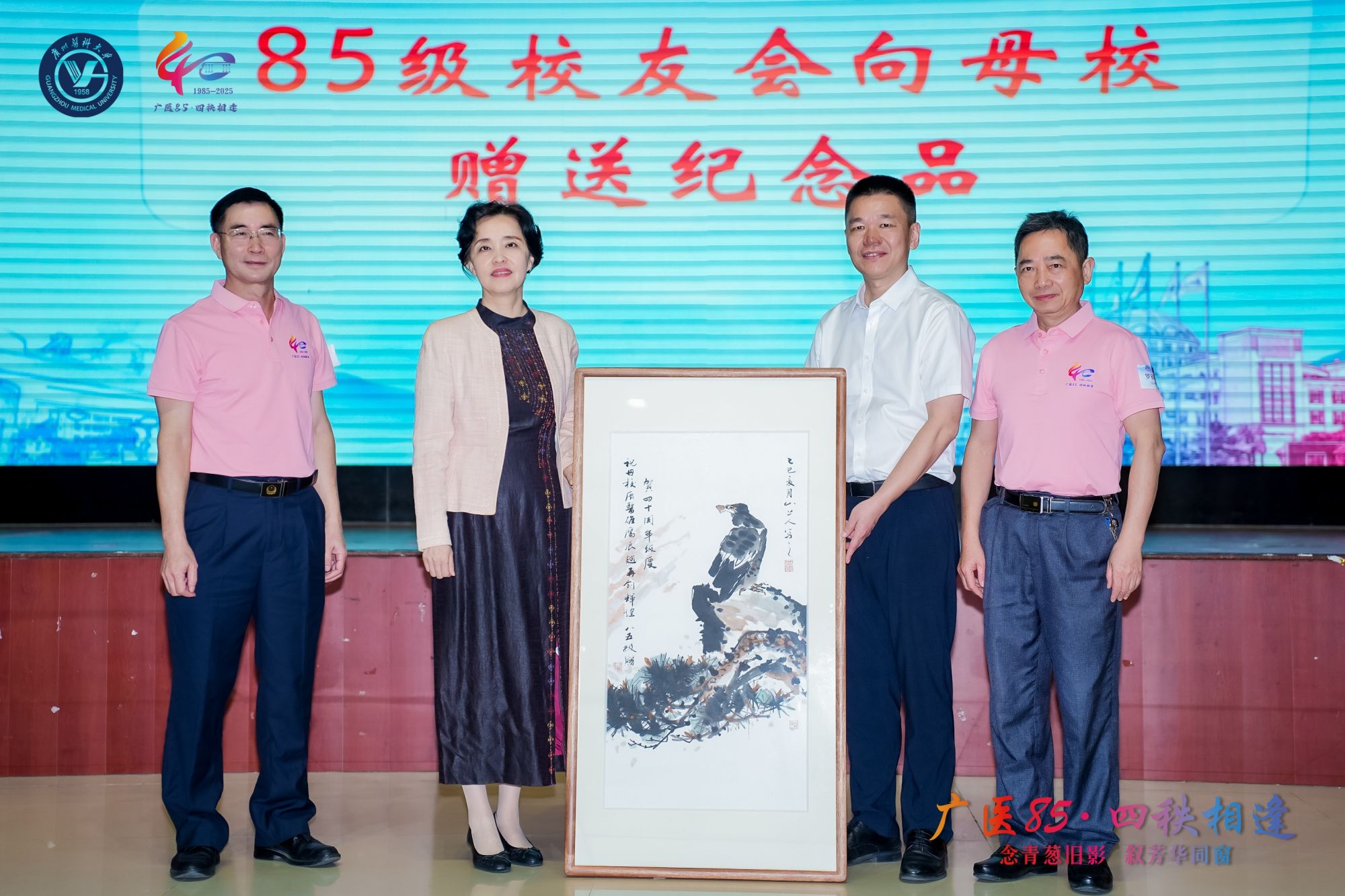 为感谢母校的培育之恩,1985级校友向学校赠送了三幅由校友冯世强、吴彤、梁永强等创作的书画作品。曾颖如书记和付晓东副校长代表学校接受赠礼并回赠纪念品。