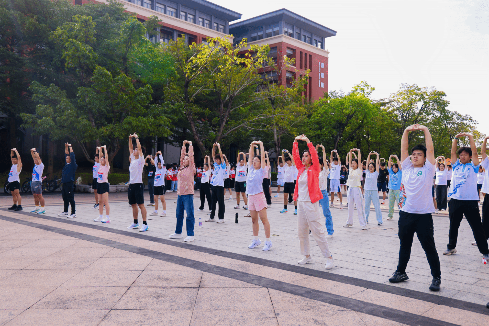 在学校体育部曾玲玲老师的带领下,参赛运动员进行跑前热身,激活身体,避免运动损伤。