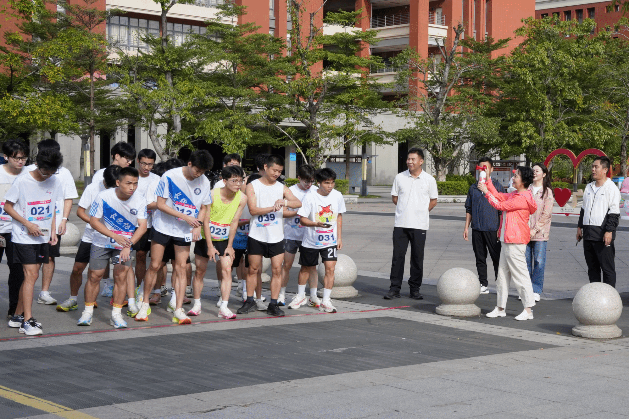 学校党委书记曾颖如、副校长周麟,相关部门负责人、教师代表与志愿者在赛前合影