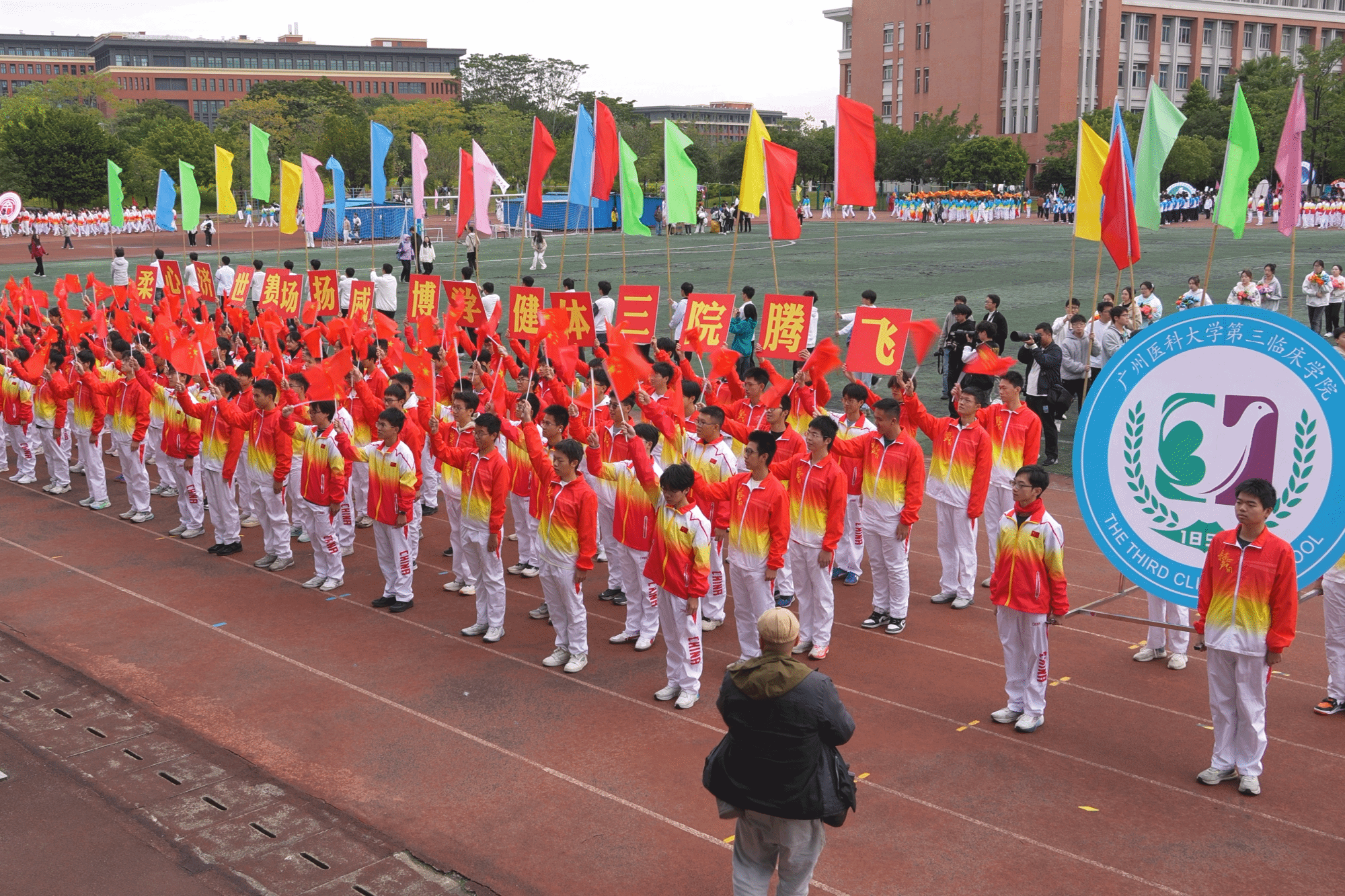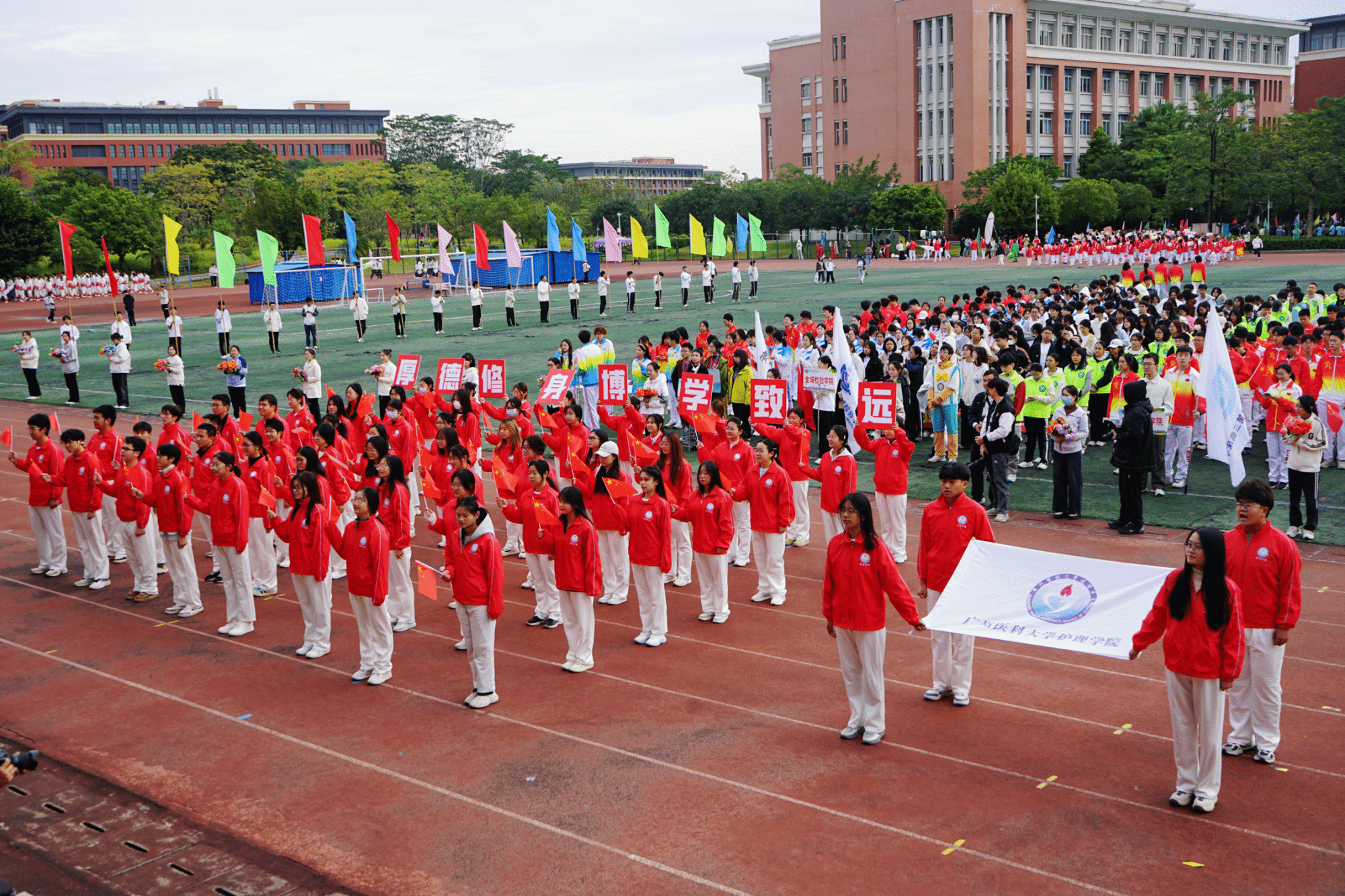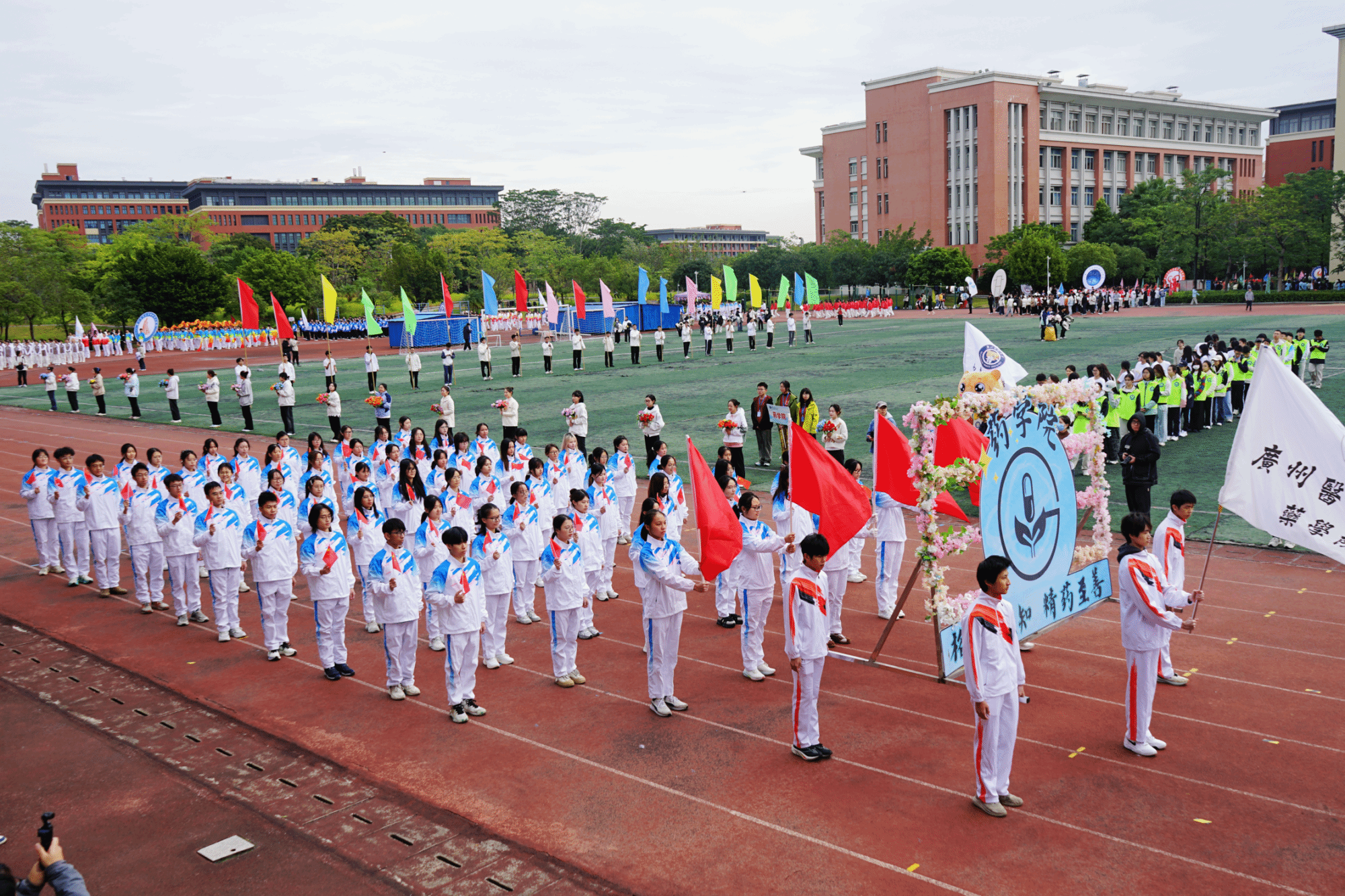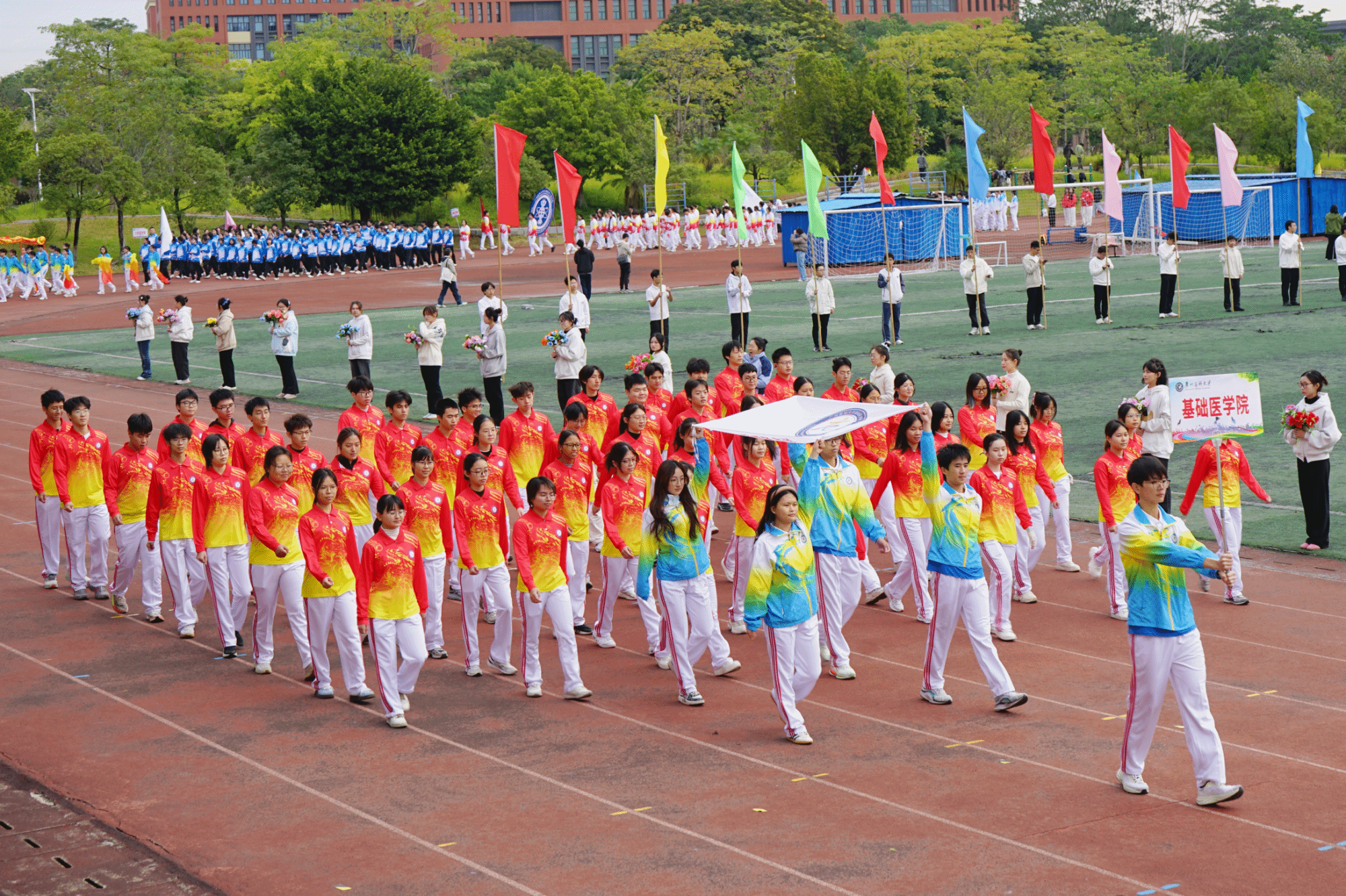 开幕式现场,国旗队、校旗队、彩旗队、鲜花队、裁判员代表队以及各学院运动方阵,昂首阔步踏入会场。各方阵整齐的步伐、嘹亮的口号,展现广医学子阳光向上、奋勇拼搏的青春姿态。