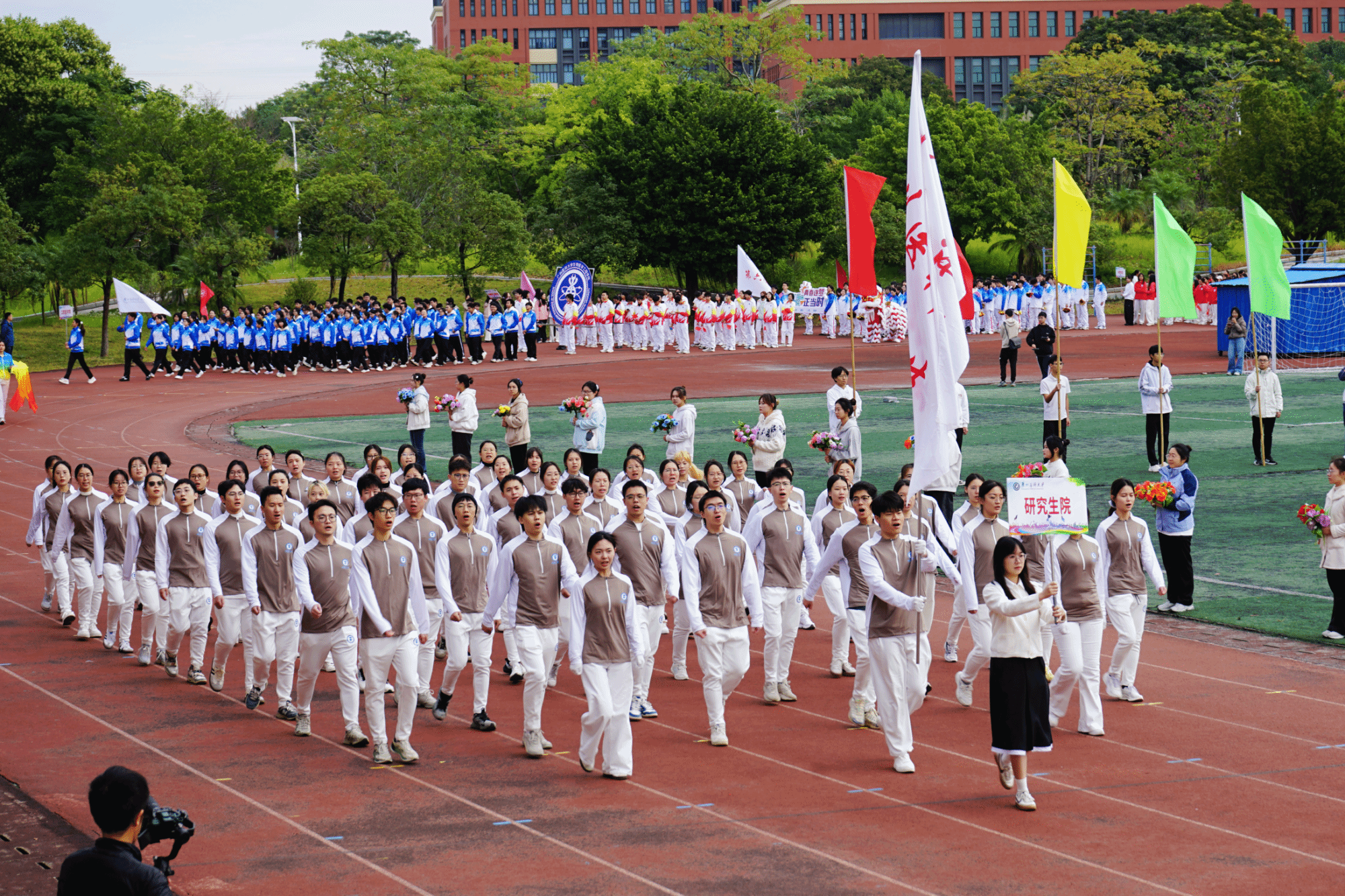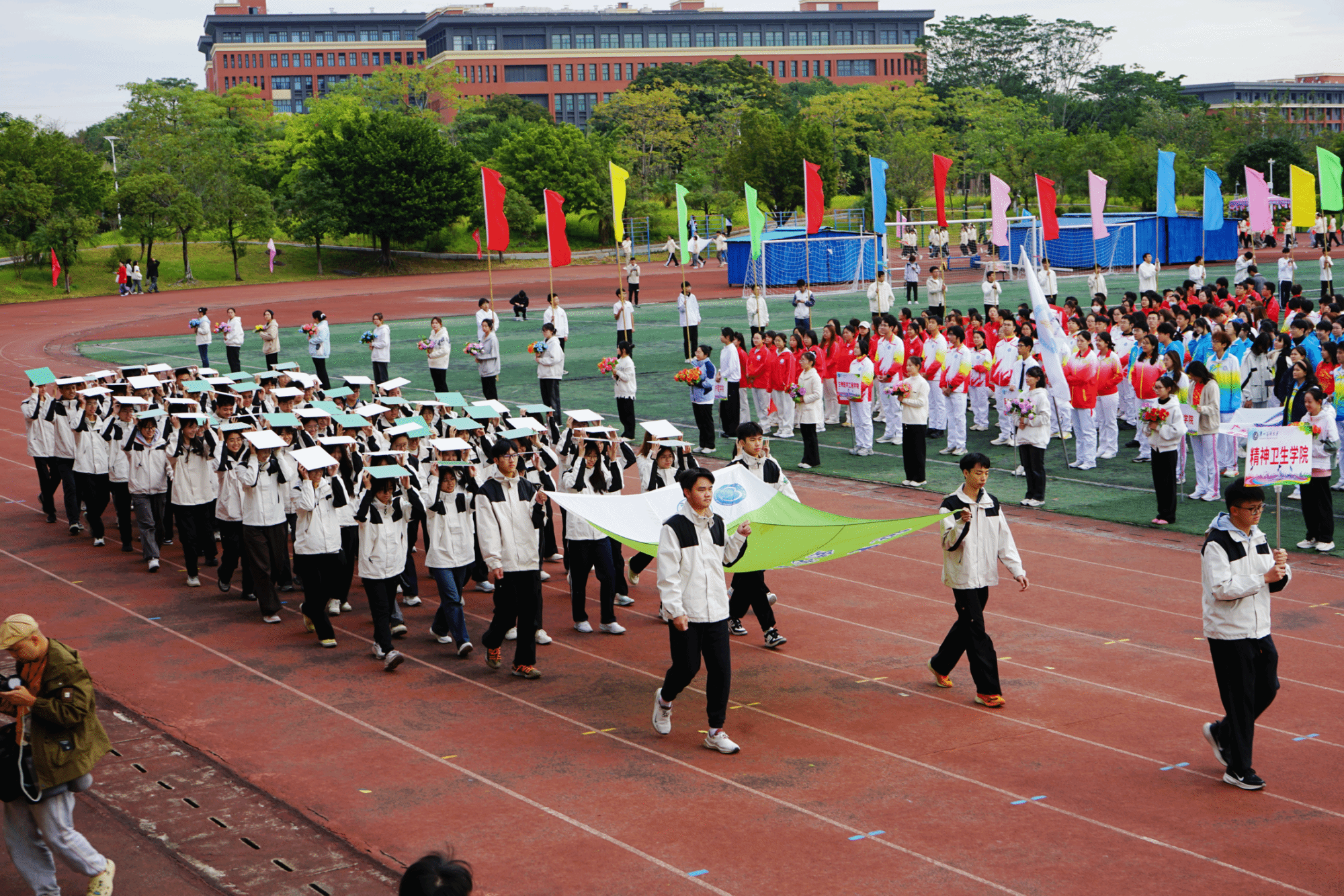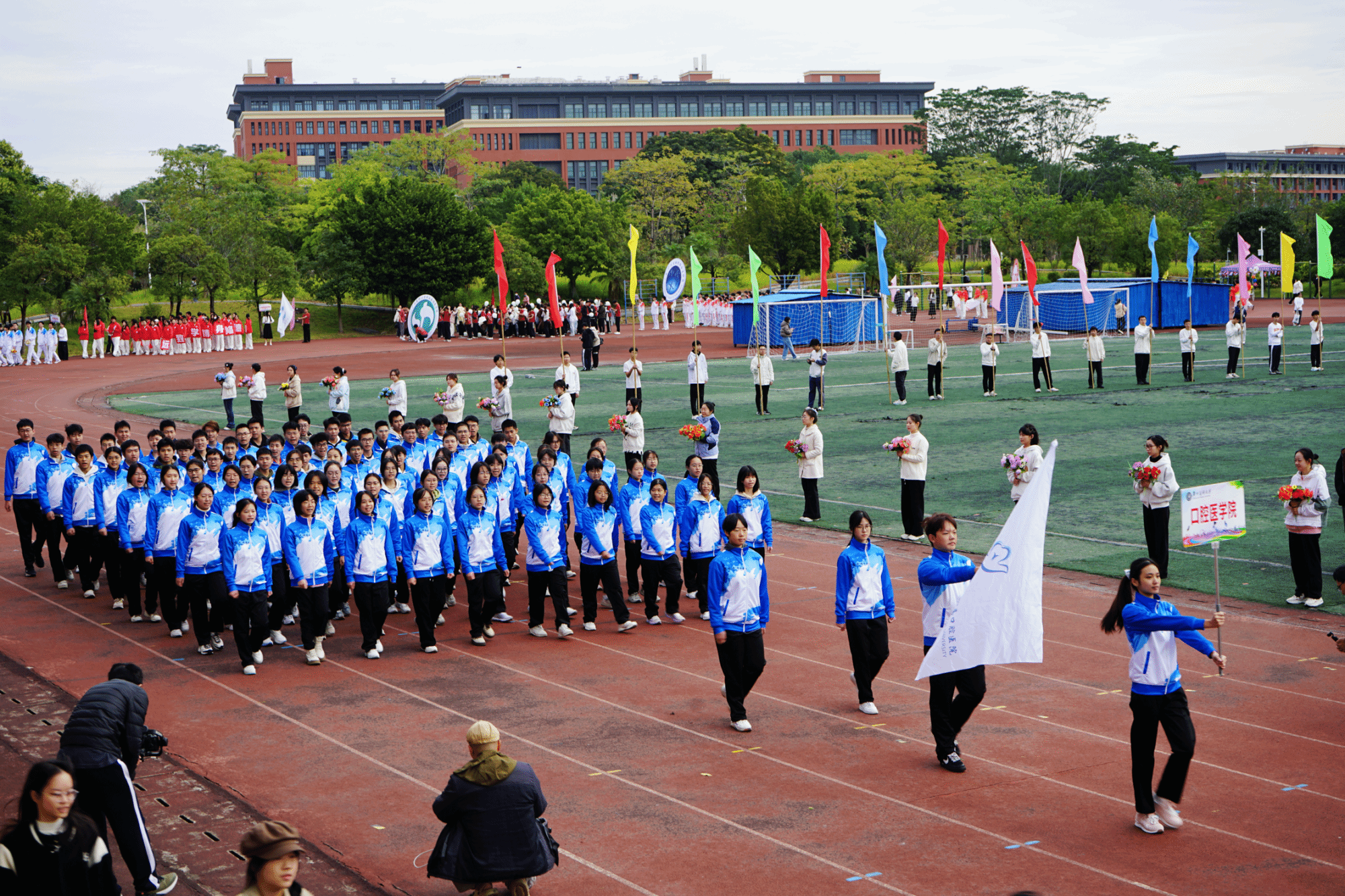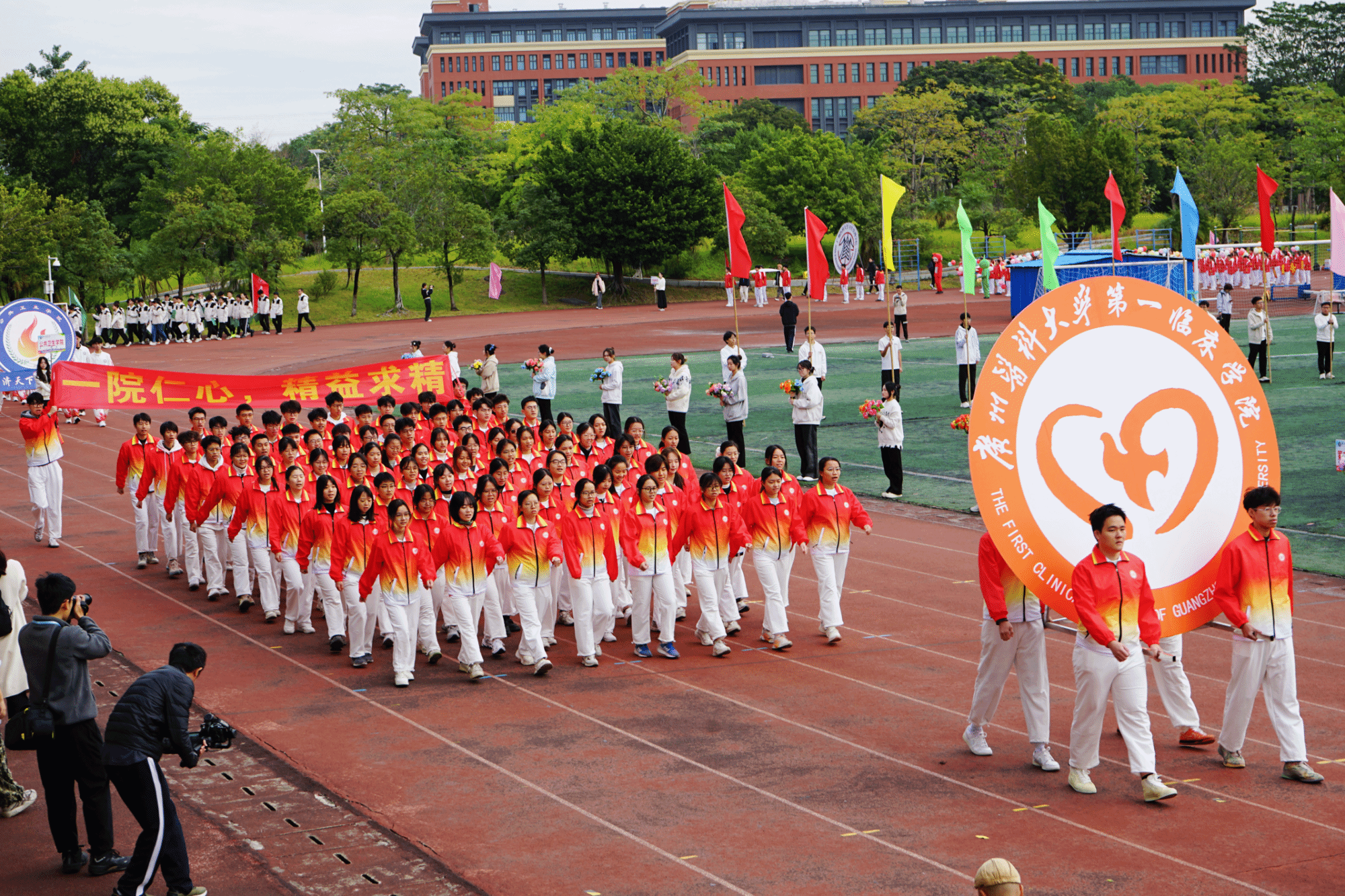 开幕式现场,国旗队、校旗队、彩旗队、鲜花队、裁判员代表队以及各学院运动方阵,昂首阔步踏入会场。各方阵整齐的步伐、嘹亮的口号,展现广医学子阳光向上、奋勇拼搏的青春姿态。