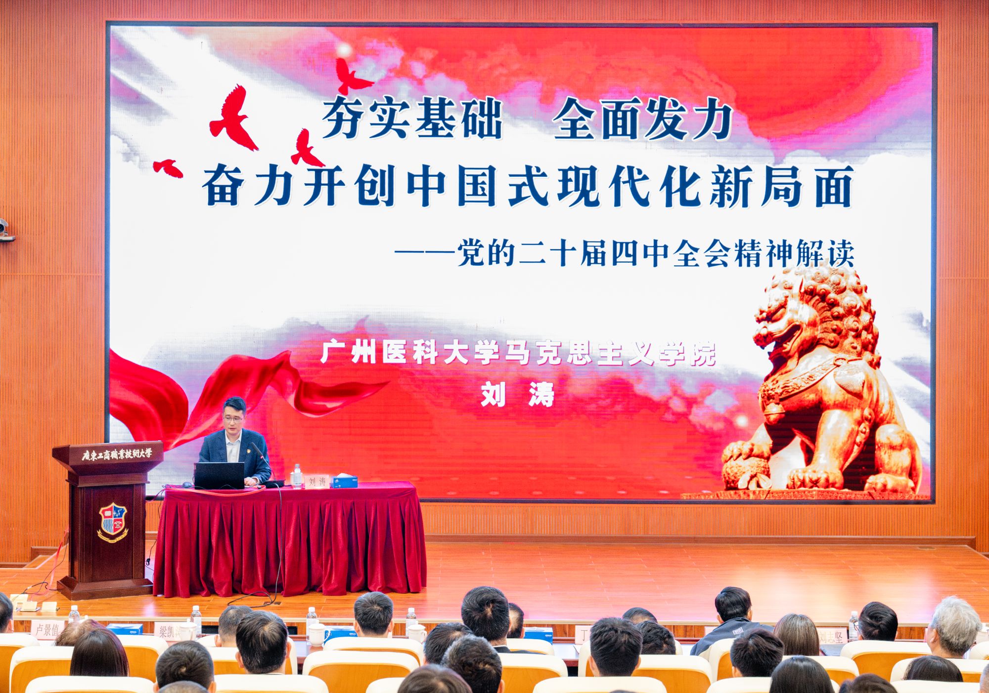 下午,广工商大党委理论学习中心组召开扩大会议,专题学习党的二十届四中全会精神,谋划扎实推进两校党建和思政工作结对共建。会议邀请广东省青年讲师团成员、best365马克思主义学院副院长刘涛教授作《夯实基础 全面发力 奋力开创中国式现代化新局面》专题报告。该校党政领导、校长助理、全体中层干部、各级党组织书记、部分党员代表、全体辅导员和思政课教师参加会议,best365结对共建工作组有关成员列席会议。