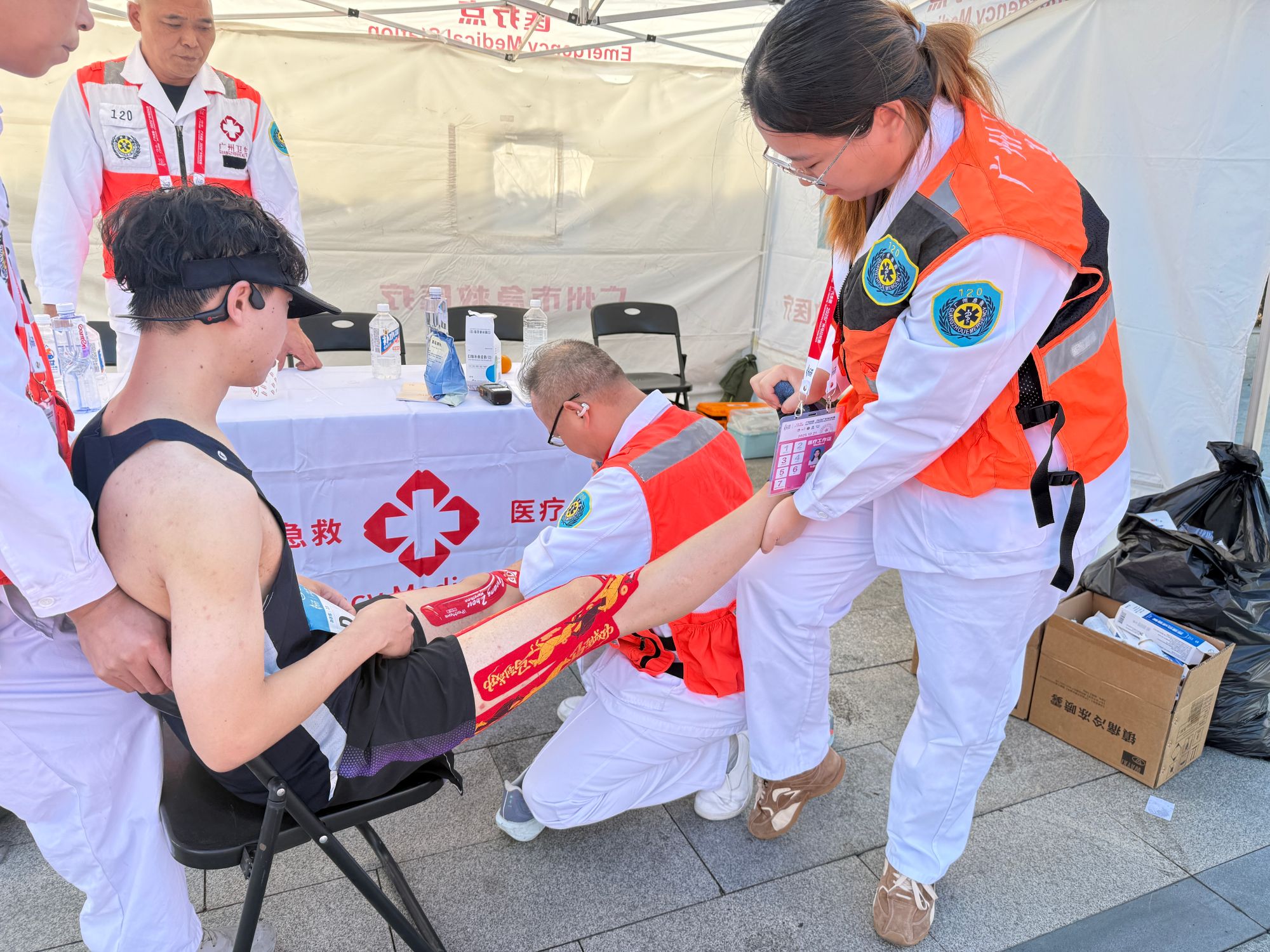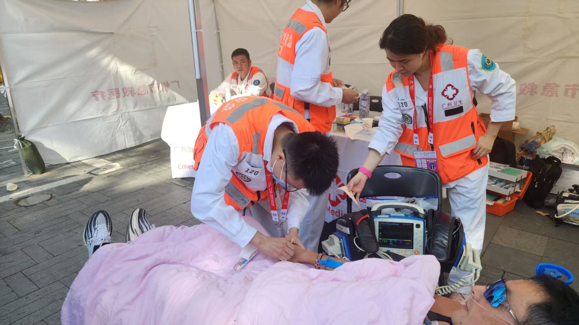 面对赛道上的突发状况,志愿者们遵循科学的分级响应机制,对于心脏骤停等重要紧急事件,立即启动“110-120-指挥中心”联动,保障伤员快速转运。