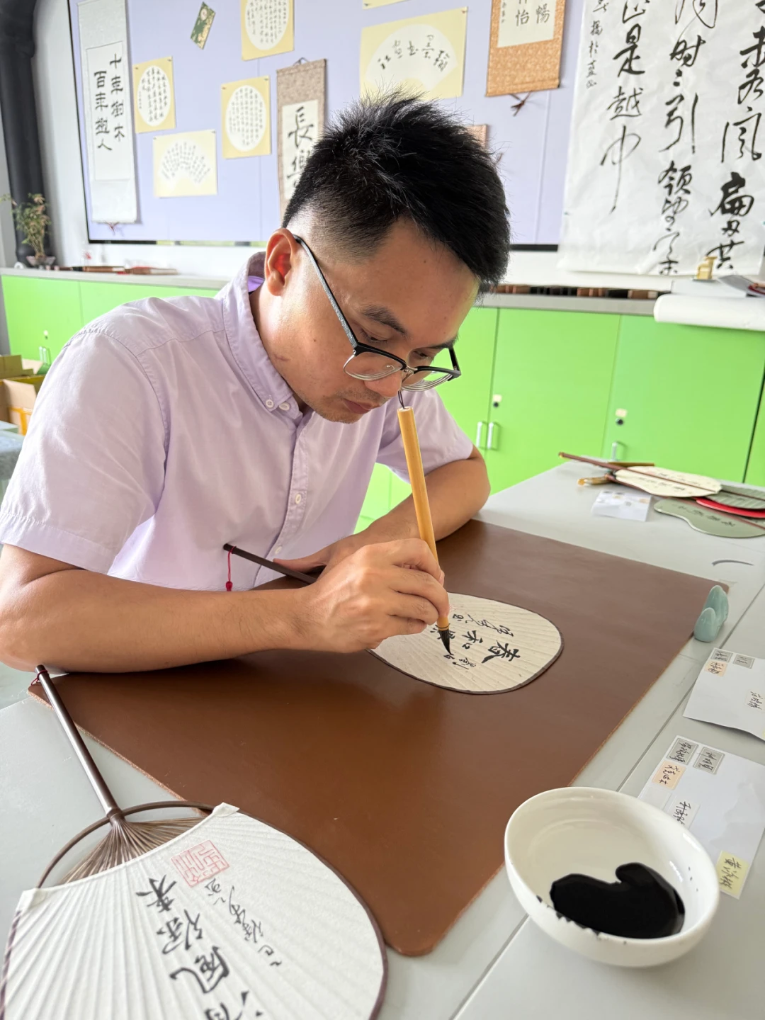 徐步乙正在书写扇面
