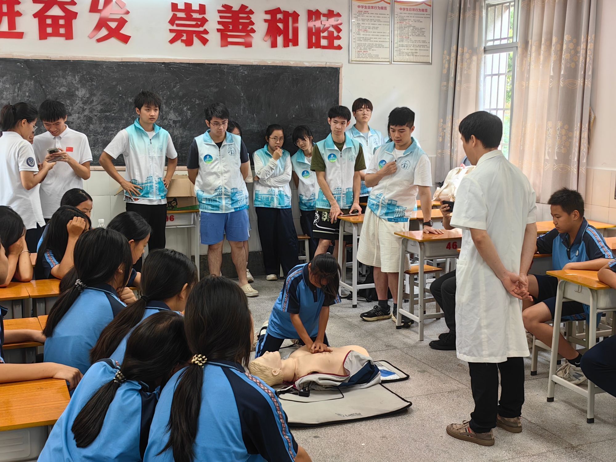 此次活动以“医心护航、青春筑梦”为主题,将专业实践与家国情怀深度融合,让志愿者们在服务基层群众中践行使命担当。best365中国官方网站学生志愿者化身“急救教官”,在连山壮族瑶族自治县永和镇永和中学的课堂上,细致演示心肺复苏(CPR)的标准动作,向学生们精准讲解操作要点,包括按压深度需达5厘米至6厘米、频率保持每分钟100次至120次等关键知识。结合夏季农村场景的实际需求,活动在往年基础上优化培训内容,新增溺水急救、中暑处理等实用技能。通过“理论讲解+模拟操作+分组PK”的创新模式,让学生们在互动中掌握要领。不少学生在实操后表示,从前面对紧急情况只会慌乱,如今掌握了急救技能,感觉自己在关键时刻也能挺身而出成为救人“小英雄”。
