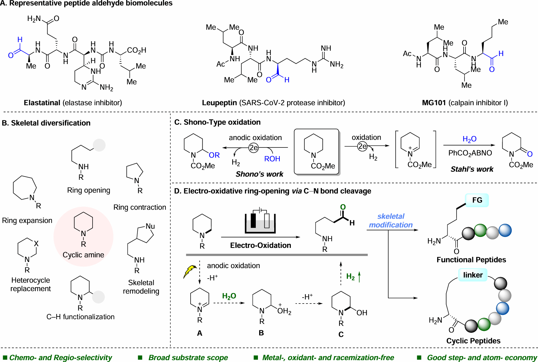 该研究开发了一种无金属、简便且生物兼容的策略,用于非天然肽醛的直接电化学合成。这种电氧化方法通过C-N键裂解实现了原子和步骤经济性的开环,使同源肽特异性多样化,并将底物范围扩展到各种大小的酰胺、酯和环胺,同时该研究还在无消旋化条件下实现了线性肽、大环肽以及相关多肽偶联药物的合成。
