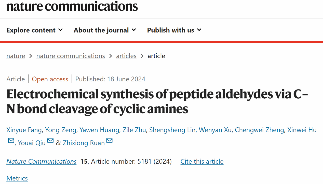 本网讯 6月18日,best365中国官方网站药学院阮志雄教授、胡新伟副教授团队在《自然通讯》(Nature Communications)上发表了题为Electrochemical synthesis of peptide aldehydes via C‒N bond cleavage of cyclic amines的研究论文。该研究在多肽电化学修饰研究领域取得了新的进展,为获得非天然肽醛分子提供了一种高效、温和绿色的合成策略。