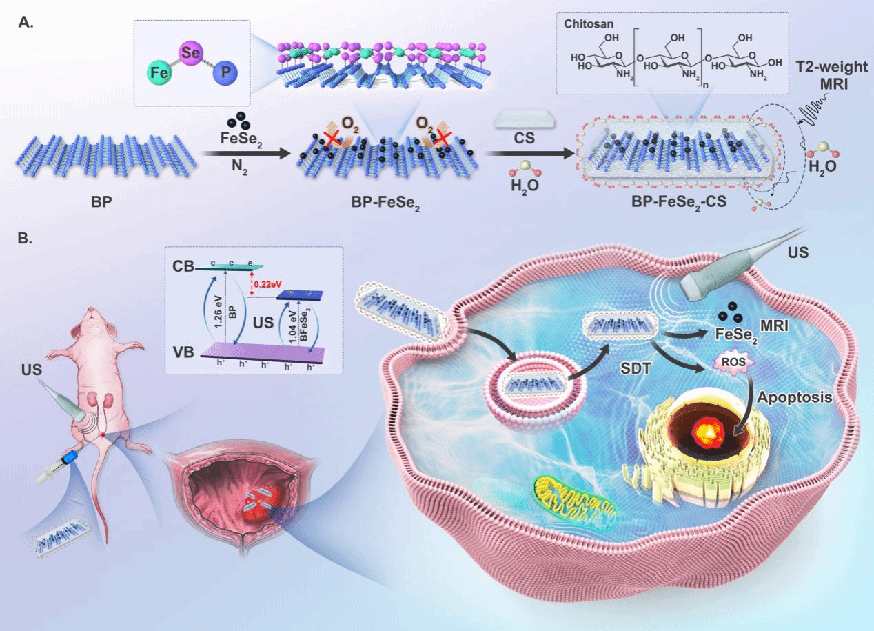 此外,为了提高SDT的抗肿瘤作用和膀胱癌的诊断能力,作者通过P-Se键将FeSe2锚定在黑磷(BP)上,合成了一种基于BP的异质结声敏剂(BFeSe2)。结果表明,BFeSe2在超声(US)照射下,对膀胱癌细胞有明显的细胞毒性。在皮下肿瘤模型和原位肿瘤模型中,BFeSe2对肿瘤生长有明显的抑制效果。此外,BFeSe2还可增强T2加权MR成像,实现对膀胱癌的监测和指导治疗的作用。总的来说,BFeSe2声敏剂结合MRI进行精确治疗,在膀胱癌的治疗中具有较强的临床应用潜力。该研究以Ferrous selenide stabilized black phosphorus heterojunction sonosensitizer for MR imaging-guided sonodynamic therapy of bladder cancer为题发表在医学一区期刊Biomaterials Research(DOI: 10.34133/bmr.001)上。best365硕士研究生吴思丞为第一作者,南山学者刘宏星研究员为最后通讯作者。
