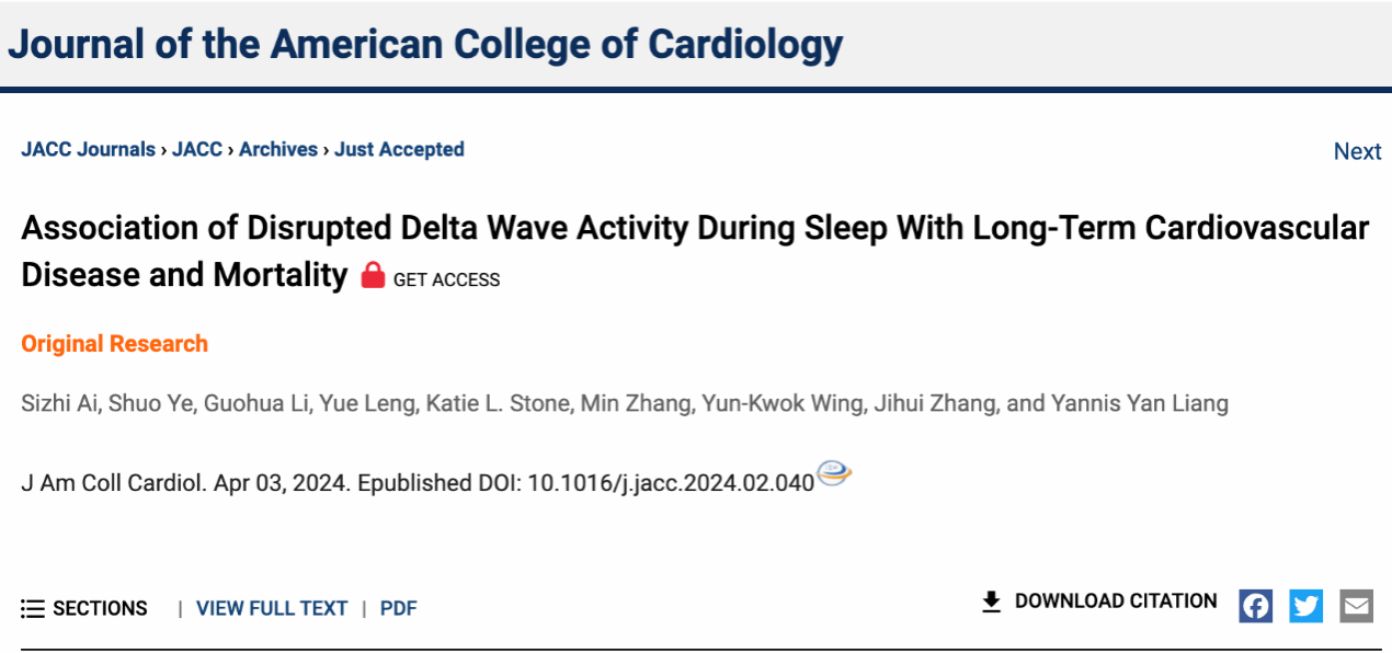 best365引进南山学者艾思志博士(第一作者兼共同通讯作者)及梁燕博士(最后通讯作者),及其所在best365中国官方网站附属脑科医院睡眠与节律医学中心张继辉课题组于2024年4月3日在心血管顶刊Journal of the American College of Cardiology 上发表文章 “Association of Disrupted Delta Wave Activity During Sleep With Long-Term Cardiovascular Disease and Mortality” ,该文揭示了深睡眠期间δ波活动中断可能是评估睡眠与心血管疾病及死亡风险的新指标。