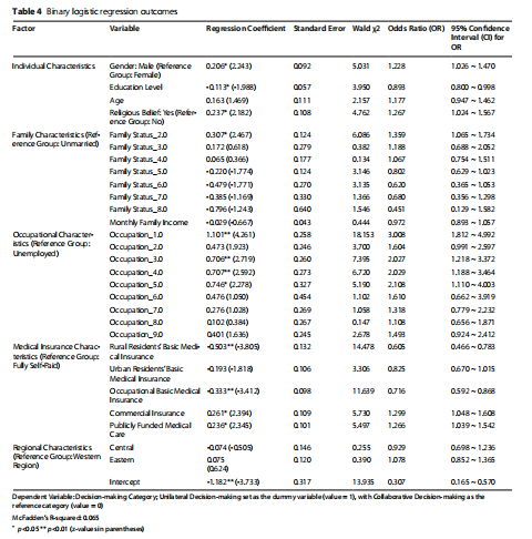 该研究在刘俊荣教授主持的国家社会科学基金项目《医疗决策中基于权益位阶的利益冲突化解机制之研究》的基础上进行,深入探讨了中国公众的医疗决策行为方式,揭示了决策模式的主要发展趋势及影响这些决策的关键因素。研究通过对2696名中国居民的调查,将医疗决策模式归纳为两大类:自主决策和协作决策。使用二元逻辑回归分析法,识别了影响这些决策模式选择的显著因素。统计结果表明,约70.81%的参与者倾向于协作型决策模式,其中医生主导型协作决策(29.90%)和医生-患者-家庭三方协作决策(24.44%)模式最为普遍。这一发现与中国的文化背景和家庭中心价值观相符。此外,模型分析结果发现,性别、教育水平、宗教信仰、家庭状况、职业和医疗保险类型等因素显著影响医疗决策模式的选择。本研究的创新性在于深入了解了中国公众医疗决策的偏好及其背后的动因,对于医疗政策制定者和医疗机构来说,提供了有益的参考,有助于更充分地满足不同群体的医疗需求。同时,随着社会的发展变化,医疗决策模式可能会发生改变,需要持续的研究和关注,以不断提升医疗服务的质量。