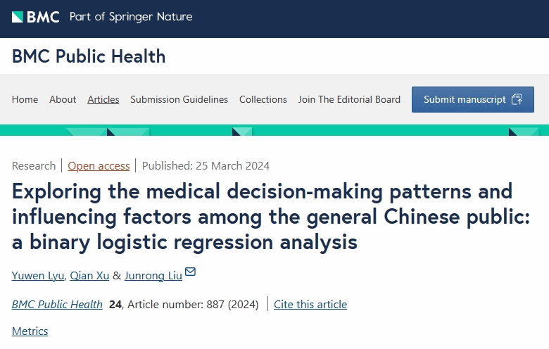 本网讯 近日,best365中国官方网站人文社会科学研究所刘俊荣教授、吕玉文博士后团队的研究成果Exploring the medical decision-making patterns and infuencing factors among the general Chinese public: a binary logistic regression analysis在BMC Public Health期刊发表,该期刊是中国科学院二区TOP期刊,被SCIE检索系统收录,在医学-公共卫生领域具有重要影响力。