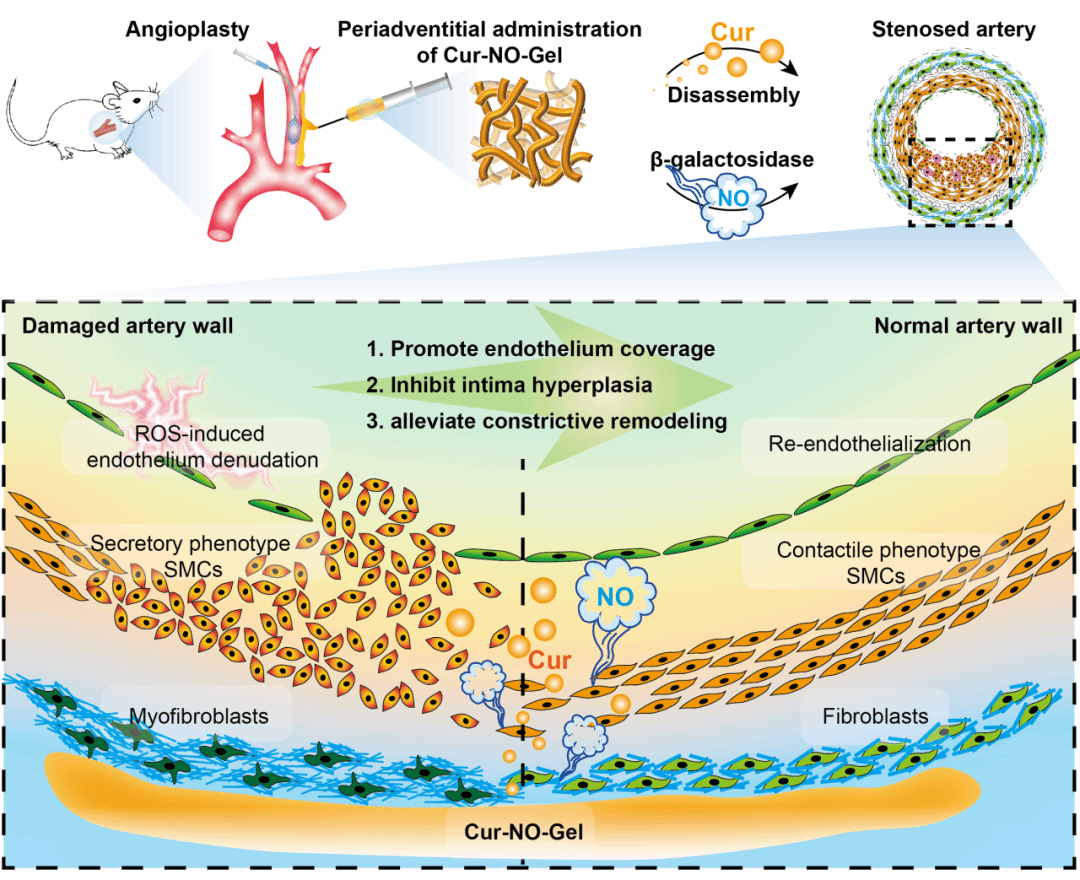 为了解决上述挑战,作者开发了一种调控动脉重塑的集成化水凝胶(Cur-NO-Gel)。作者首先制备了一种能够在β-半乳糖苷酶催化下释放一氧化氮(NO)的多肽成胶因子,然后在制备水凝胶时封装姜黄素,制备了Cur-NO-Gel。Cur-NO-Gel结合了NO的舒张血管效应和姜黄素抑制新生内膜并保护内皮的功能,通过三种途径抑制血管成形术后的血管狭窄(促进内皮细胞再生、抑制血管内膜增生、改善收缩性重塑)。