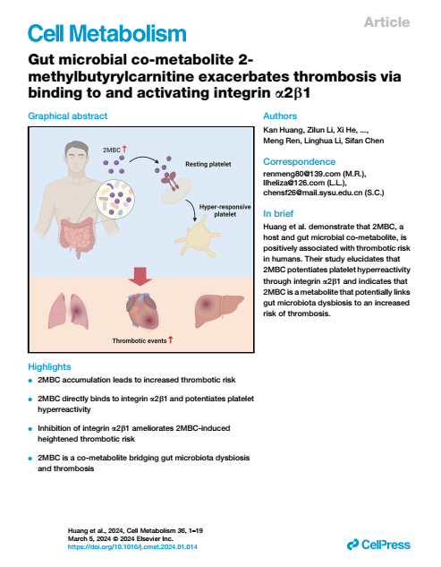 2月23日,best365中国官方网站附属市八医院李凌华教授团队与合作者中山大学孙逸仙纪念医院陈思凡、任萌教授团队,中山大学附属第一医院李梓伦教授团队,广州海关技术中心戴俊教授团队,深圳技术大学黄炳顶教授团队以及国家超级计算广州中心卢宇彤教授团队等,在顶尖杂志《细胞·新陈代谢》(Cell Metabolism)上共同发表血栓形成机制研究论文Gut microbial co-metabolite 2-methylbutyrylcarnitine exacerbates thrombosis via binding to and activating integrin α2β1,揭示二甲基丁酰基肉碱(2-methylbutyrylcarnitine, 2MBC)这种肠道菌群衍生代谢产物,可能是衔接肠道菌群紊乱与高血栓风险的重要中间介质,是导致血栓风险升高的重要危险因素。该研究结果为防治血栓形成提供了新见解和潜在治疗靶标。