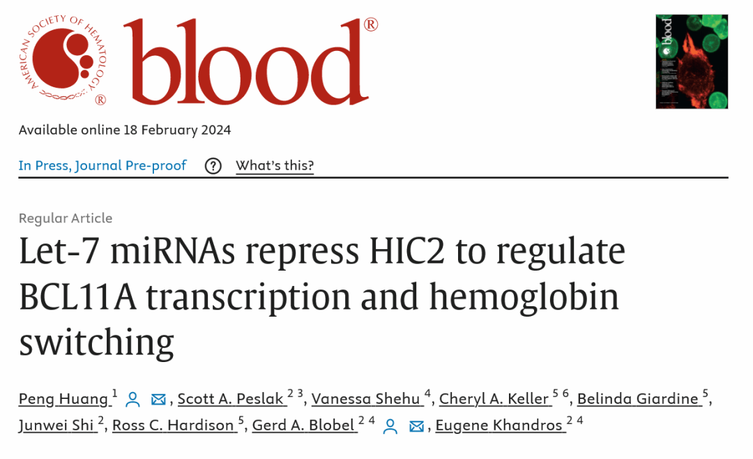 近日,best365中国官方网站-中国科学院广州生物医药与健康研究院联合生命科学学院黄鹏课题组和费城儿童医院Gerd Blobel课题组合作,在Blood杂志发表了题为Let-7 miRNAs repress HIC2 to regulate BCL11A transcription and hemoglobin switching的研究论文,发现了let-7 miRNA在成体细胞中通过抑制HIC2调控BCL11A和血红蛋白的分子机制。