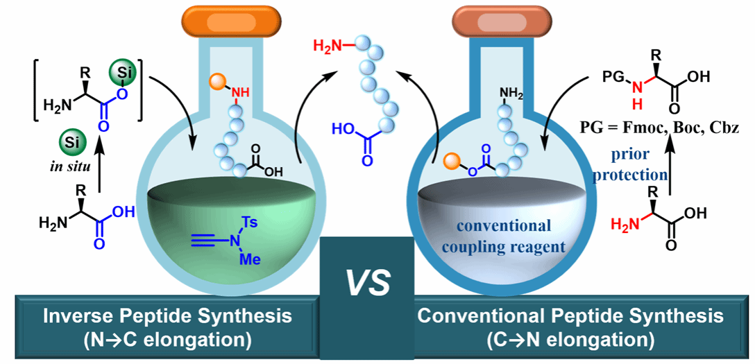 多肽药物近年来发展迅猛,成为药物研发的重要增长点。除少数多肽药物可通过生物合成外,大部分多肽药物是通过曾获诺贝尔化学奖的固相多肽合成技术来制备的。但传统多肽化学合成必需以氨基预先保护的氨基酸为原料,肽链每延长一个氨基酸就“额外”增加“保护”与“去保护”两步操作,造成多肽合成步骤冗长,产生大量的化学废物等问题,导致多肽合成成本高昂,并对绿色化学提出严峻挑战。科学家早在60多年前就提出了无保护氨基酸逆向合成多肽的策略,避免了保护与去保护操作,是一种理想的绿色多肽合成策略。但遗憾的是肽链逆向延伸过程中严重的消旋问题导致该策略一直未能成功。