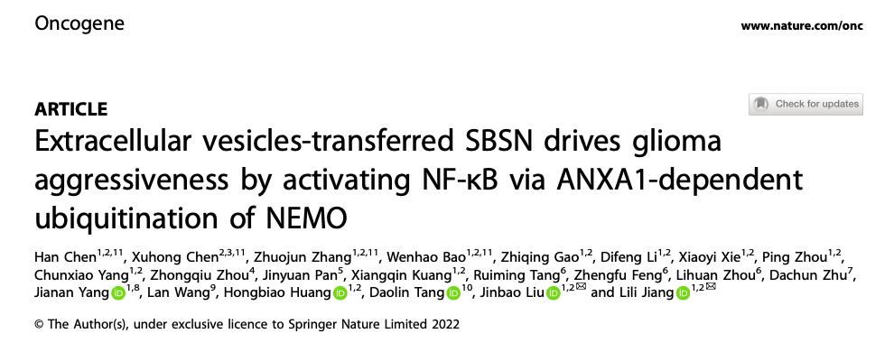 近日,best365基础医学院广东省蛋白质修饰与降解重点实验室刘金保、蒋丽丽教授团队研究揭示了细胞外囊泡(Extracellular vesicles,EVs)介导的癌蛋白SBSN细胞间转运激活NF-B信号通路促进胶质瘤侵袭的重要机制。相关研究“Extracellular vesicles-transferred SBSN drives glioma aggressiveness by activating NF-B via ANXA1-dependent ubiquitination of NEMO”发表在期刊《Oncogene》。该研究结果证实EVs携带并转运SBSN蛋白在胶质瘤细胞间实现信号和功能传递,同时对胶质瘤NF-B通路调控关键蛋白的多泛素化修饰过程提供了新的理论支持。