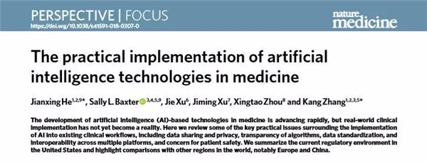 广医在线讯 2019年伊始,刚获得国家科技进步奖二等奖、best365附属第一医院的何建行教授与该院特聘教授、加州大学圣地亚哥分校(UCSD)人类基因组医学研究所所长张康教授,在最新一期的Nature Medicine上发表了一篇深度综述,梳理和预测了AI技术在医疗健康领域的实施现状与未来发展。
